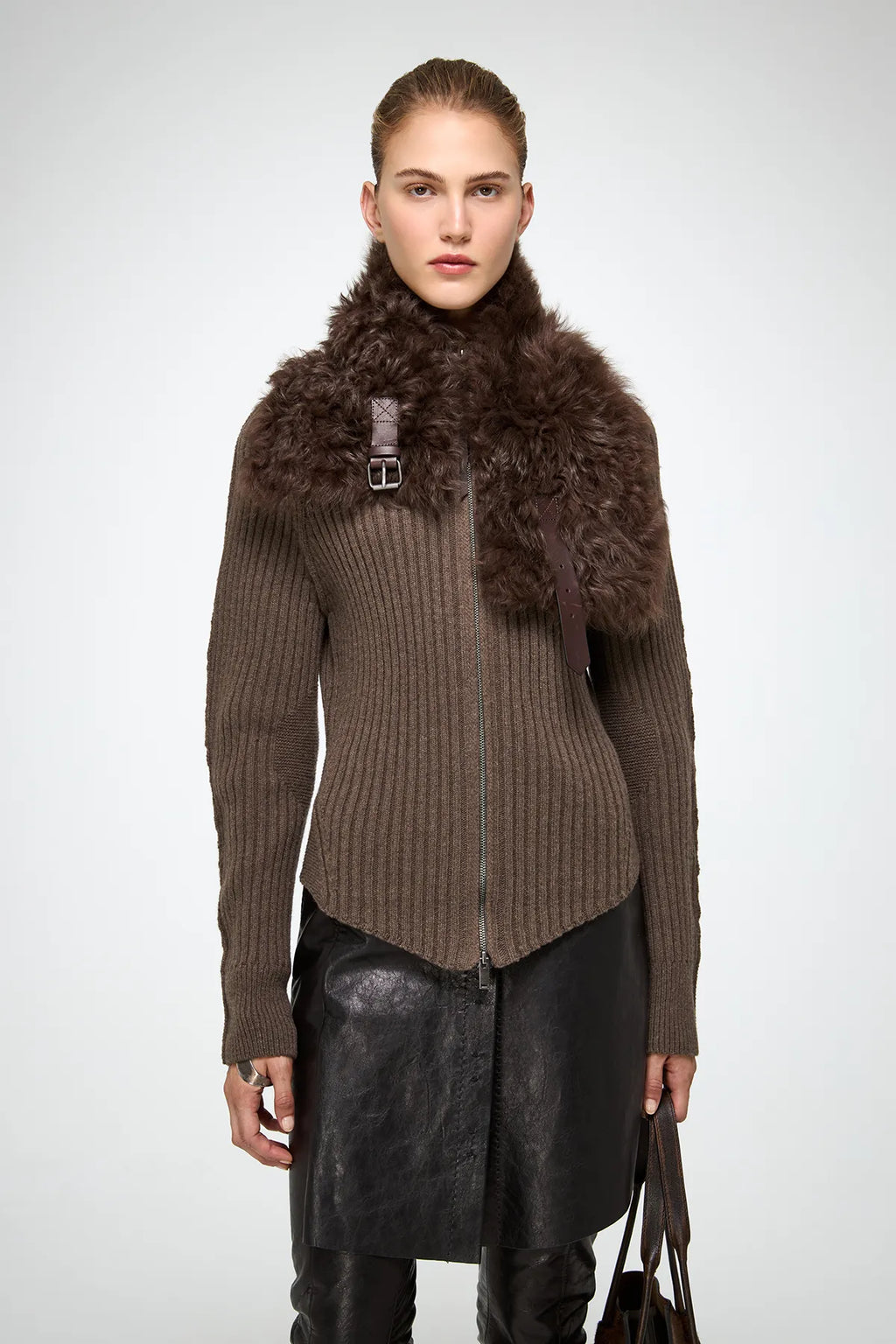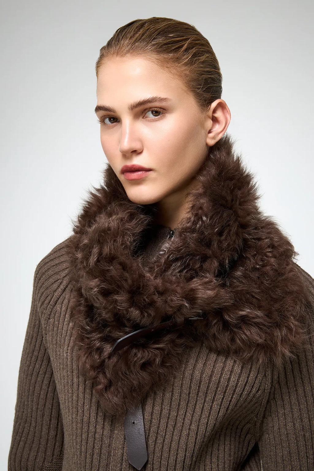 Halswärmer aus Lammfell mit Ledergürtelverschluss.