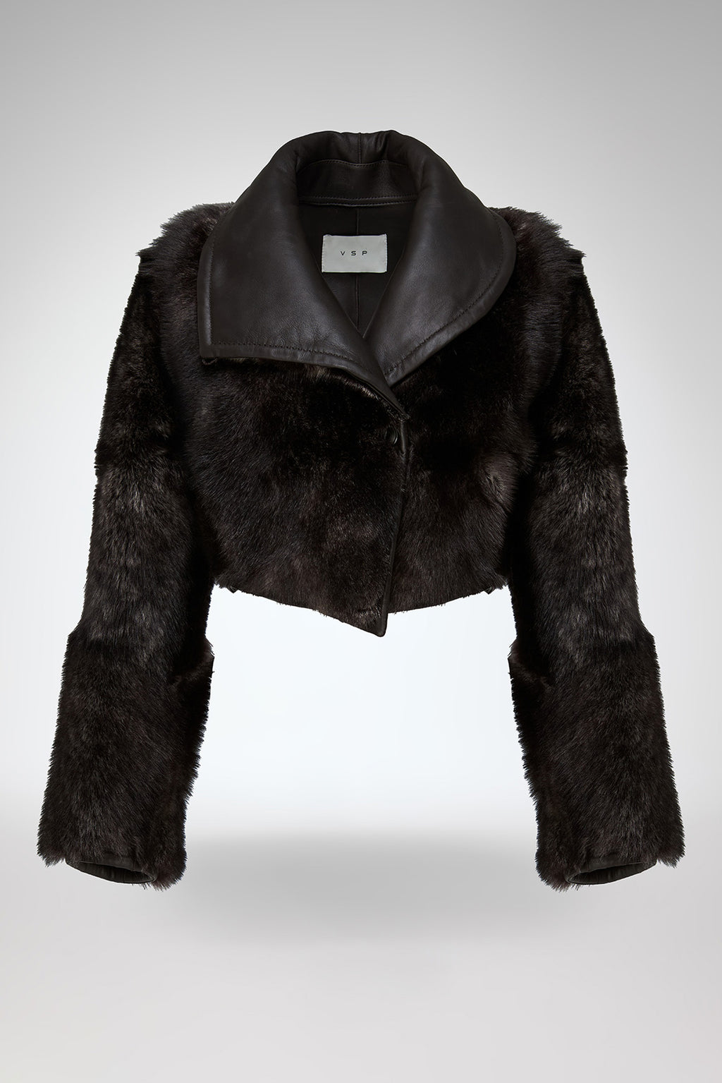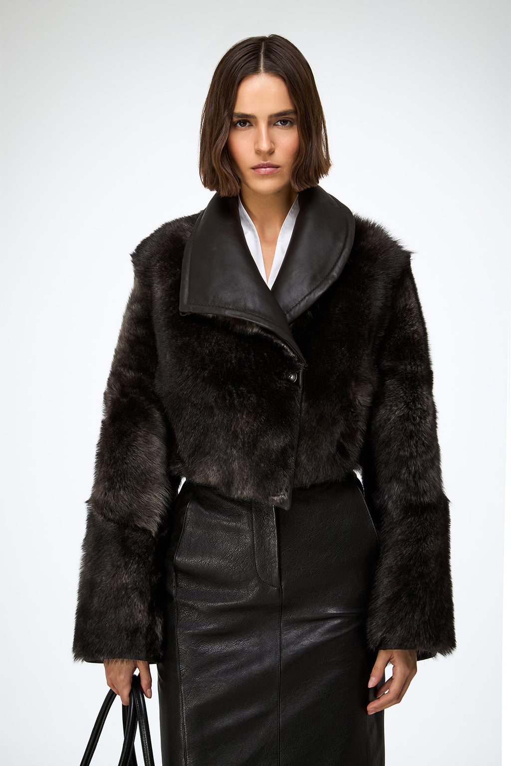 Crafted from plush shearling. Cropped jacket with side pockets, button closure, asymmetrical front leather turn down collar. Fitted silhouette.