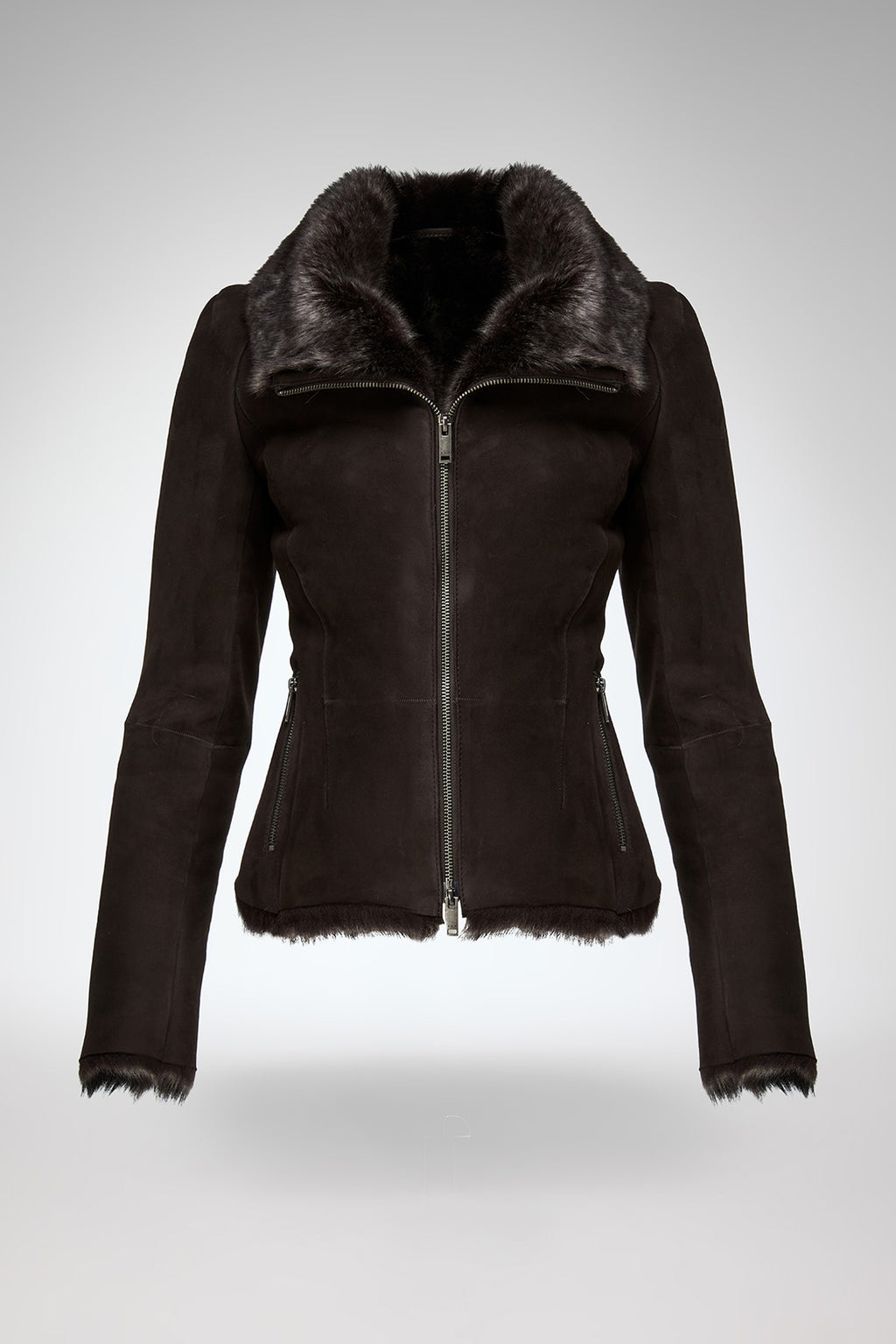 Cropped cut suede finish. Leather shearling jacket. Double sided front zipper closure. Zippered side pockets, stand up collar. Fitted jacket.
