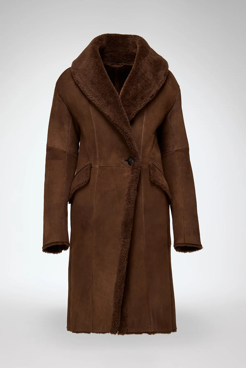 Dieser hüftlange Shearling-Mantel aus 100 % Lammleder besticht durch seine luxuriöse, vintage-weiche oder lappeartige Oberfläche. Er verfügt über einen Frontreißverschluss und eine taillierte, figurbetonte Passform für eine elegante Silhouette. Seitliche Reißverschlusstaschen und offene Eingrifftaschen runden das edle Design ab.