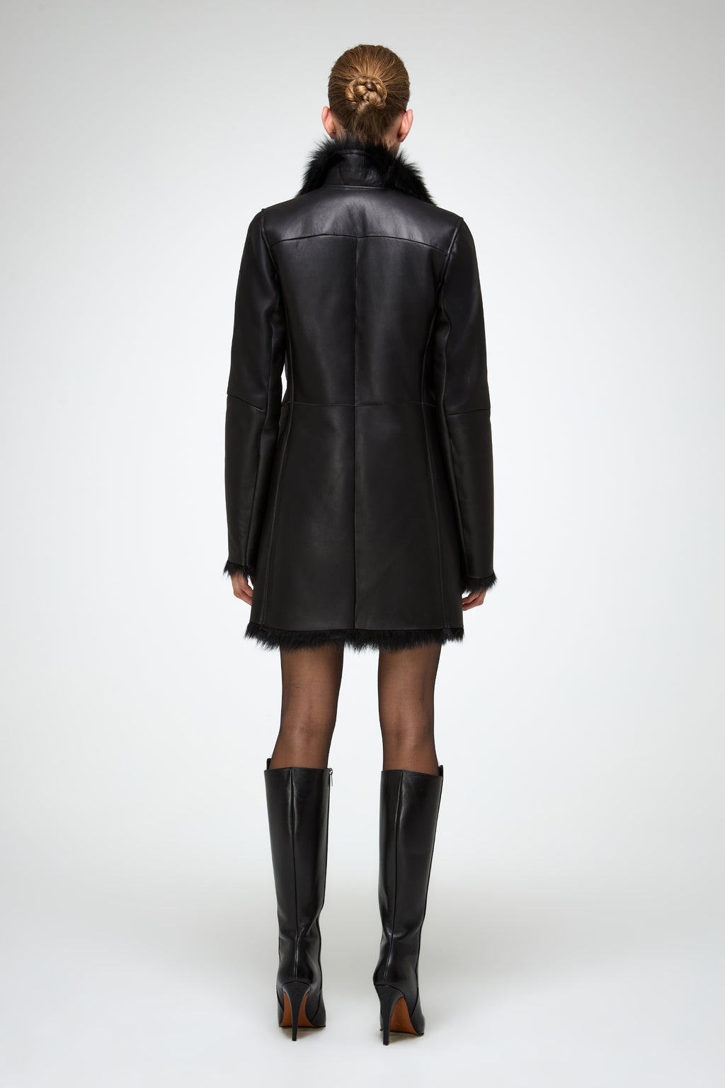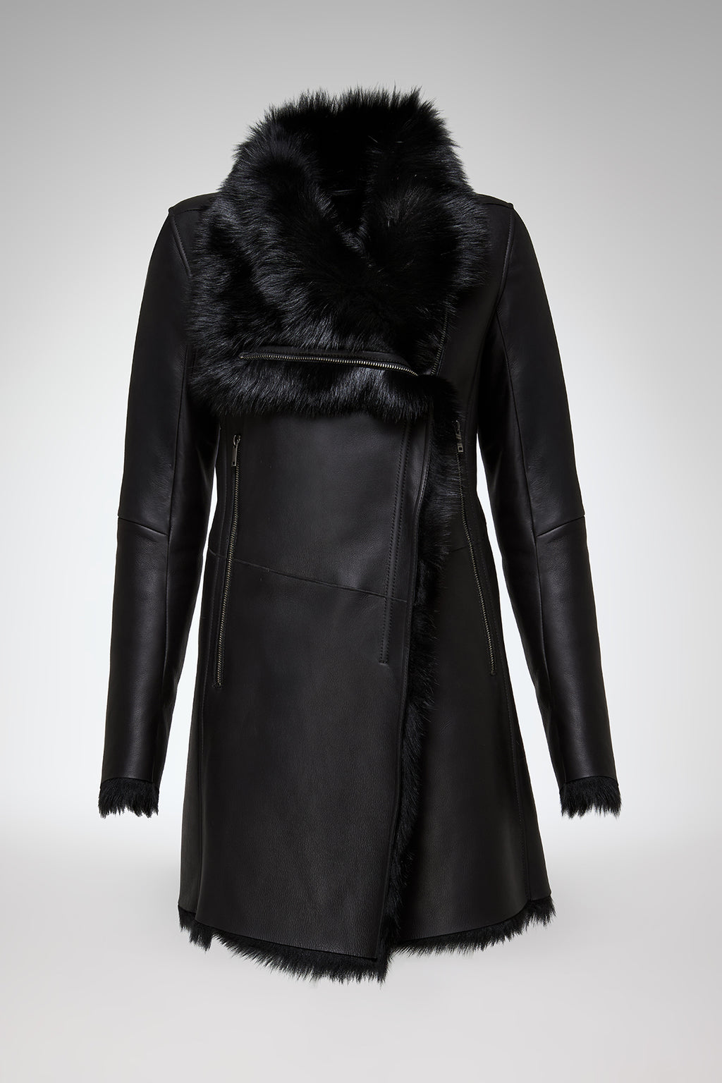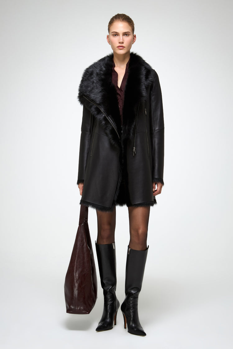 Dieser knielange Mantel aus Veloursleder-Shearling besticht durch einen asymmetrischen Reißverschluss und einen Stehkragen mit Pelzbesatz. Die taillierte, strukturierte Passform sorgt für eine elegante Silhouette. Seitliche Reißverschlusstaschen runden das stilvolle Design ab.