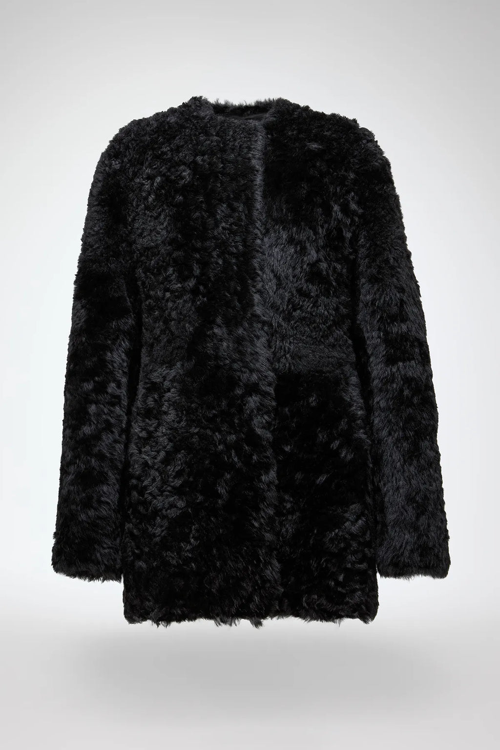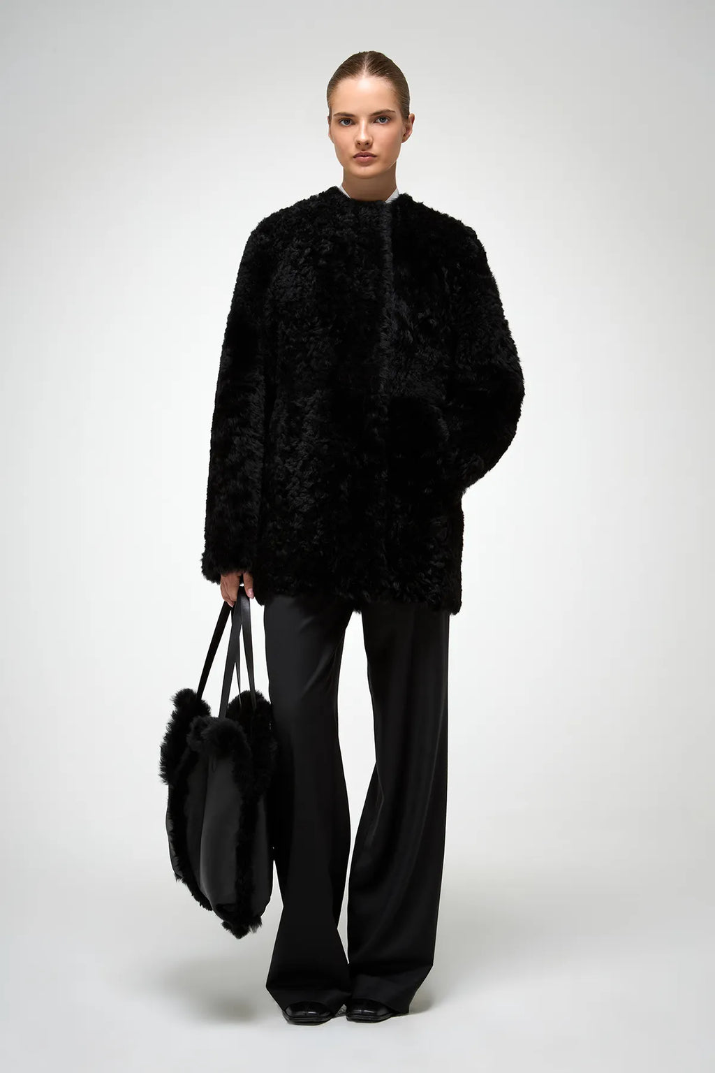 Dieser hüftlange Mantel aus 100 % Lammleder besticht durch seine reguläre, taillierte Passform, Eingrifftaschen und verdeckte Druckknöpfe mit Lederbesatz. Der runde Kragen verleiht ihm einen eleganten, minimalistischen Look.