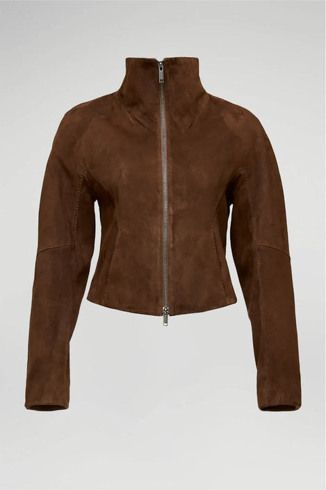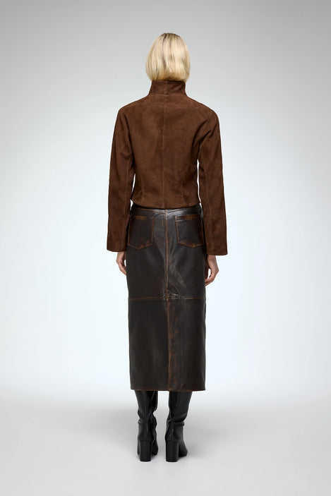 Kurze Wildlederjacke im Used-Look mit doppelseitigem Reißverschluss. Taillierter Schnitt mit Reißverschlusstaschen vorne und seitlichen Details. Handgefertigte Used-Optik für einen einzigartigen, authentischen Look.