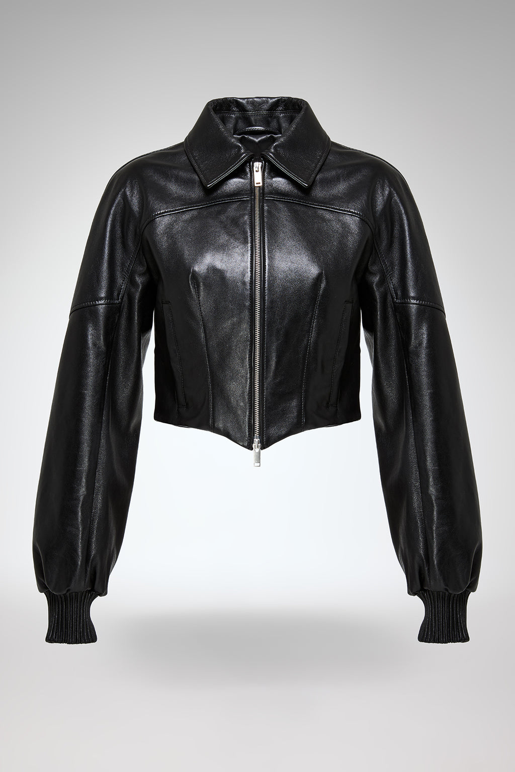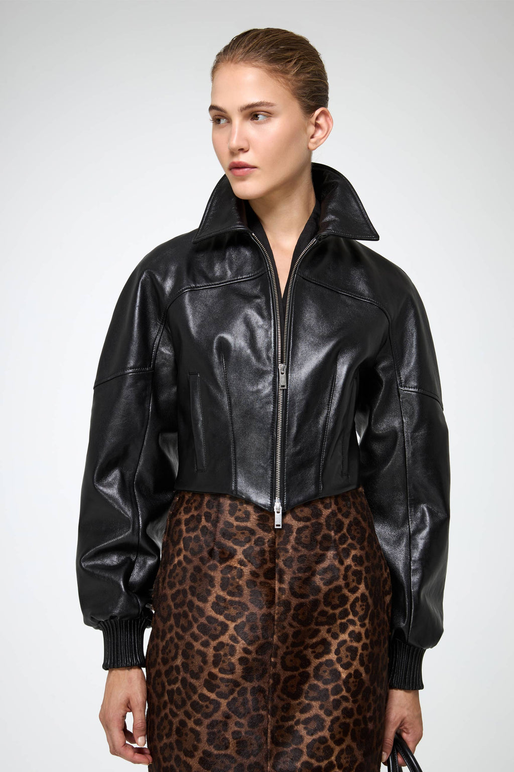 Superkurze Lederjacke mit Hemdkragen und beidseitigem Used-Look im Vintage-Stil. Ausgestattet mit Seitentaschen, elastischen Bündchen für einen sportlichen Touch und einem V-förmigen Saum vorne.