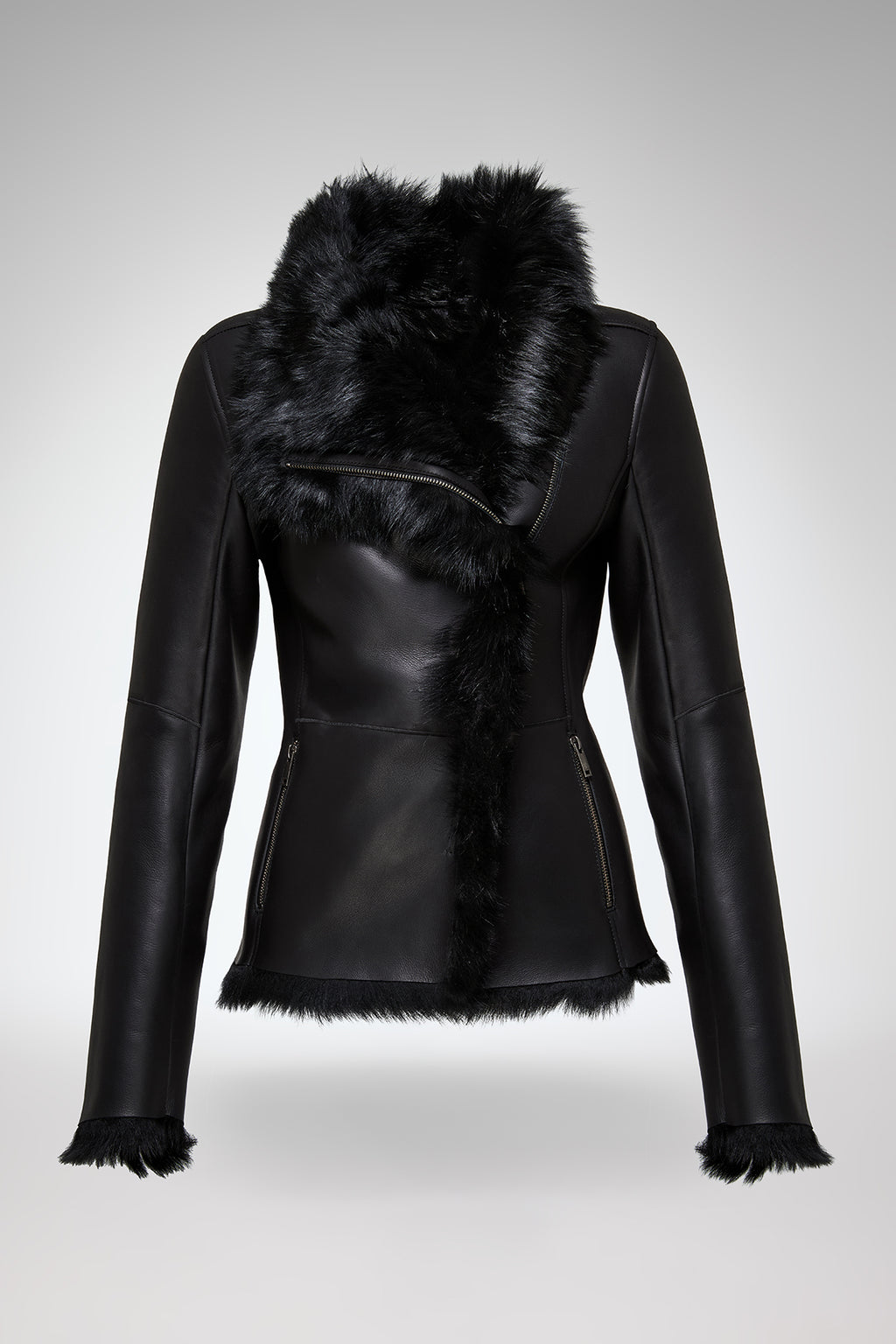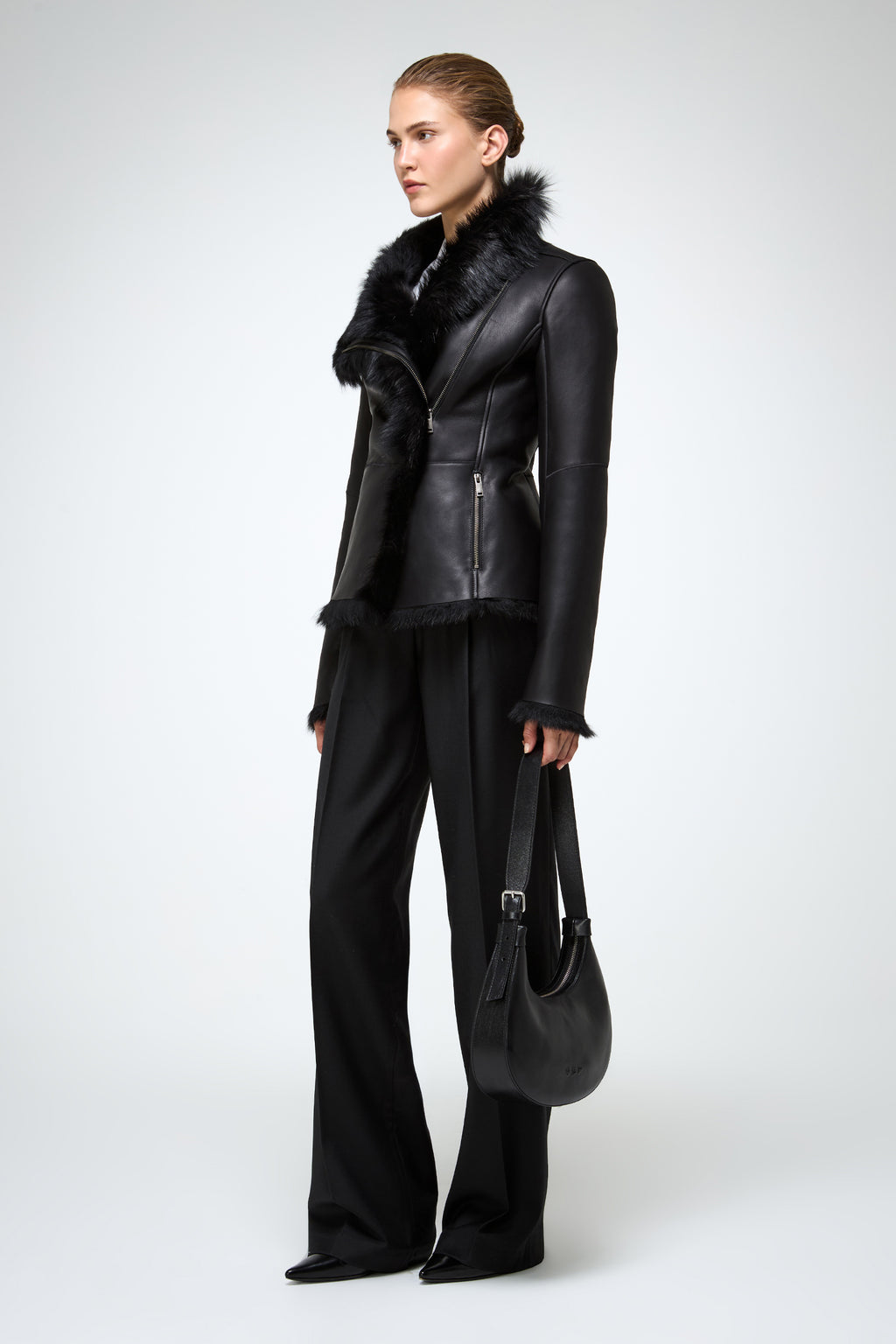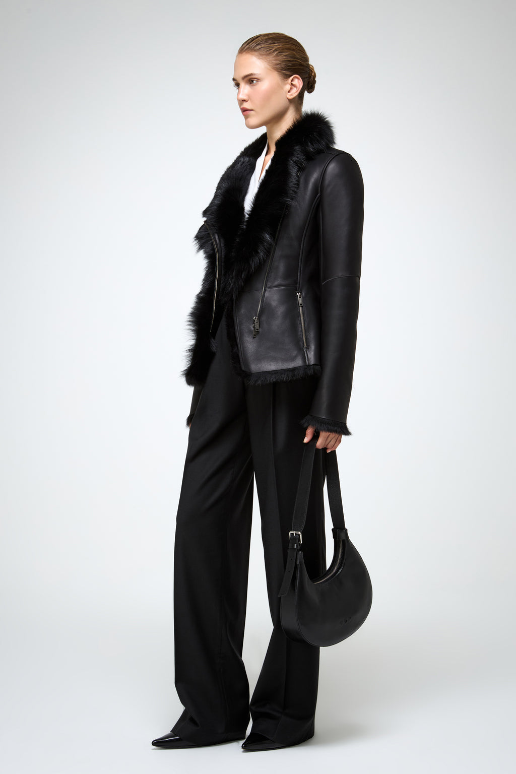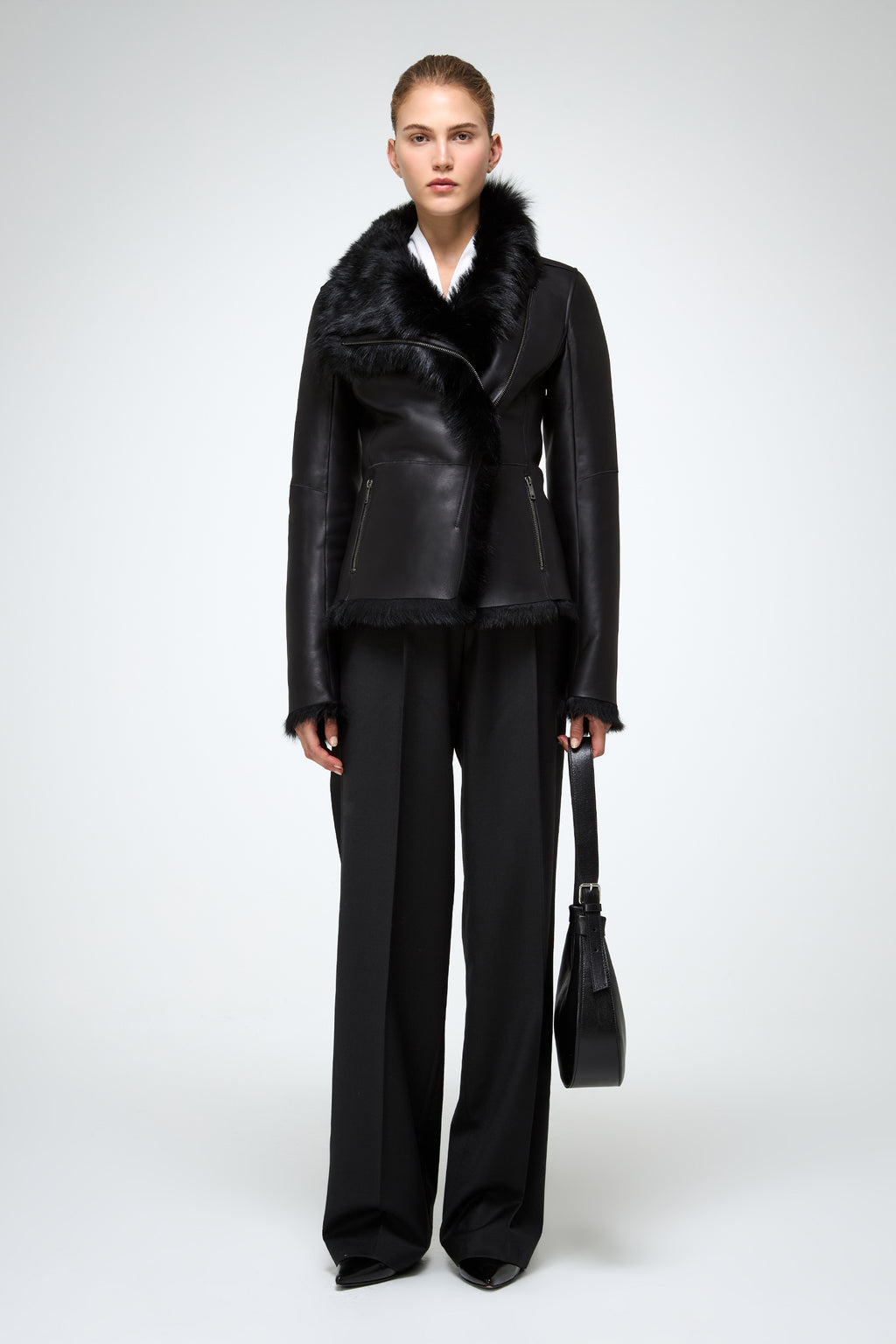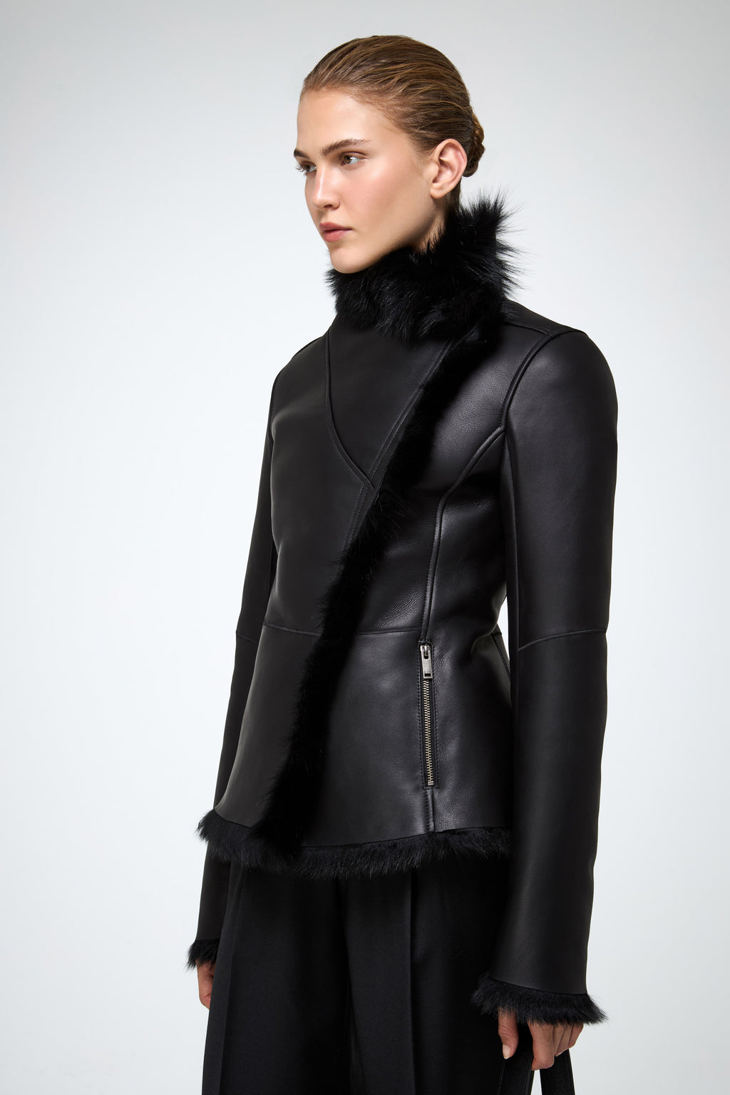 Taillierte Shearling-Jacke mit asymmetrischem, verdecktem Überkreuzreißverschluss und Seitentaschen.