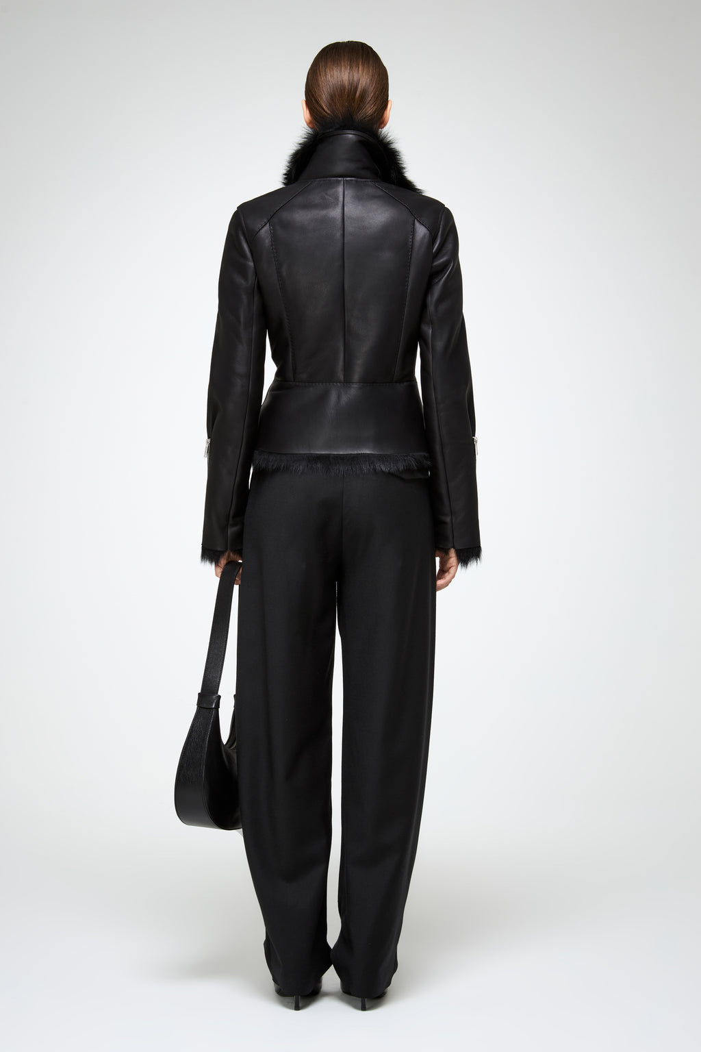 - Da Leder ein natürliches Material ist, muss es in trockener Umgebung atmen. Bitte bewahren Sie Lederbekleidung auf gepolsterten Kleiderbügeln auf und bedecken Sie sie mit einem einfachen Bettlaken oder einer Stoffmanteltasche.