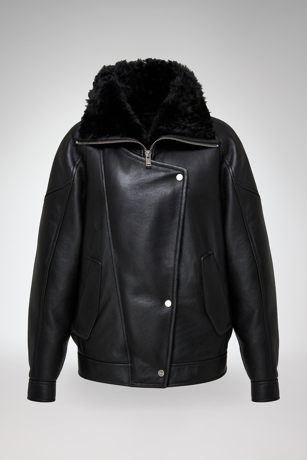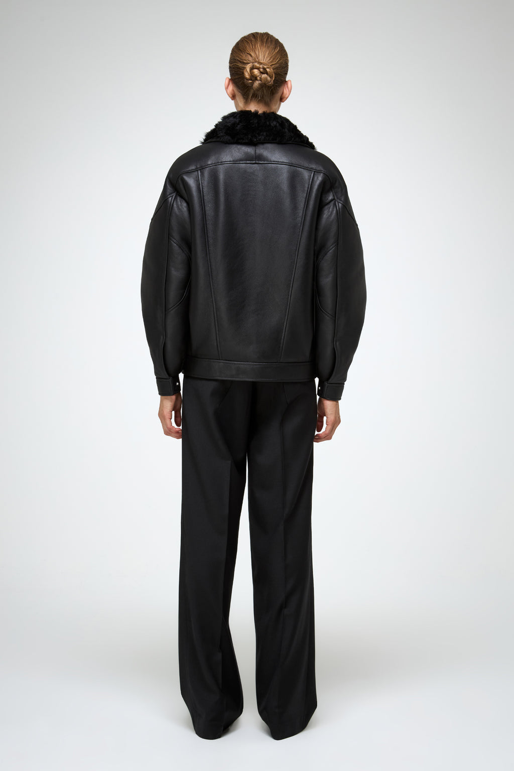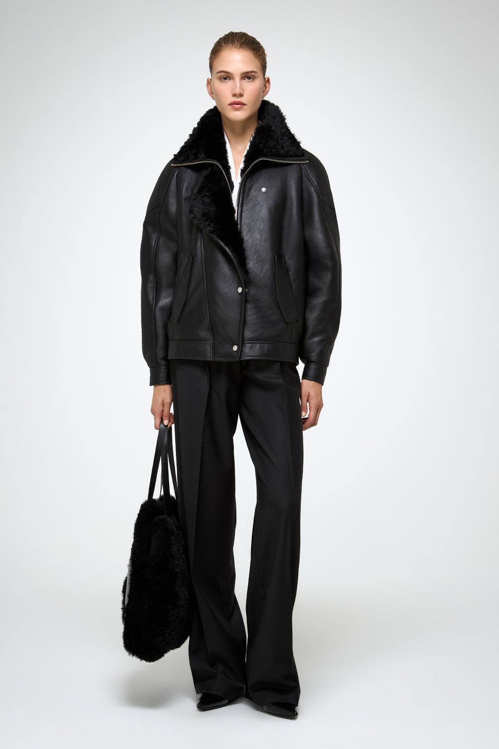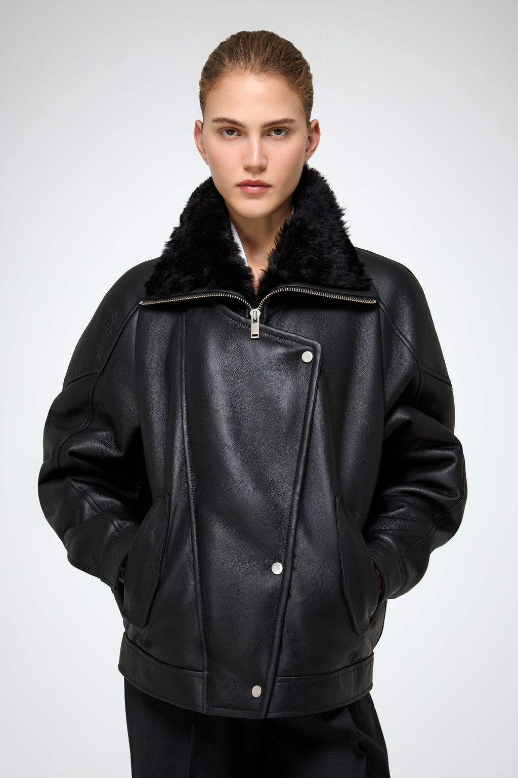 Übergroße Shearling-Jacke im Biker-Stil mit Stehkragen. Details mit Druckknöpfen und verdecktem Reißverschluss. Seitentaschen.