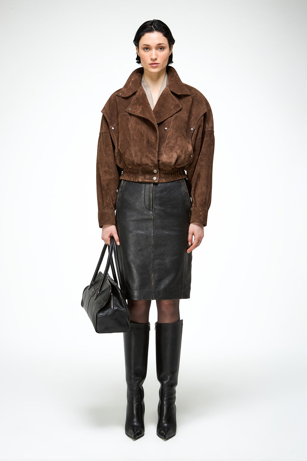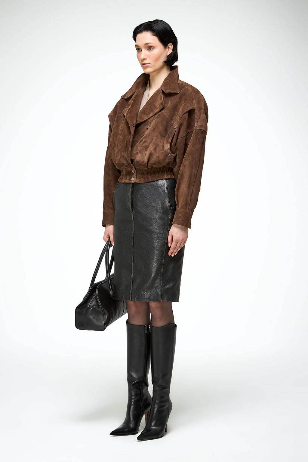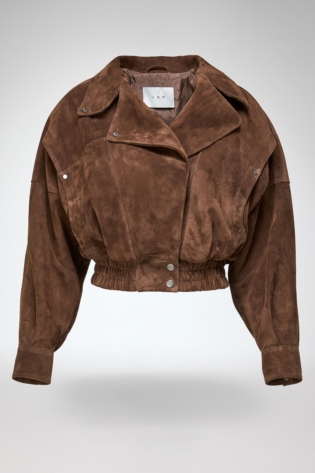 Crafted from goat suede. Super cropped 80's biker style batwing sleeve jacket. Fitted on the waist, side pockets. Snap buttons on the waist and collar zipper asymmetrical front closure.