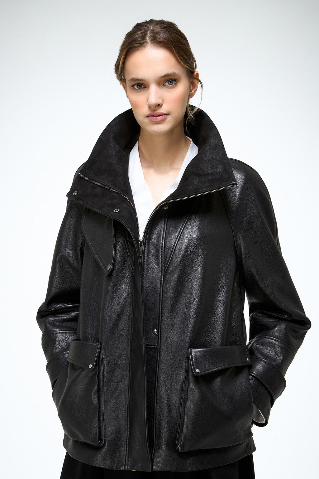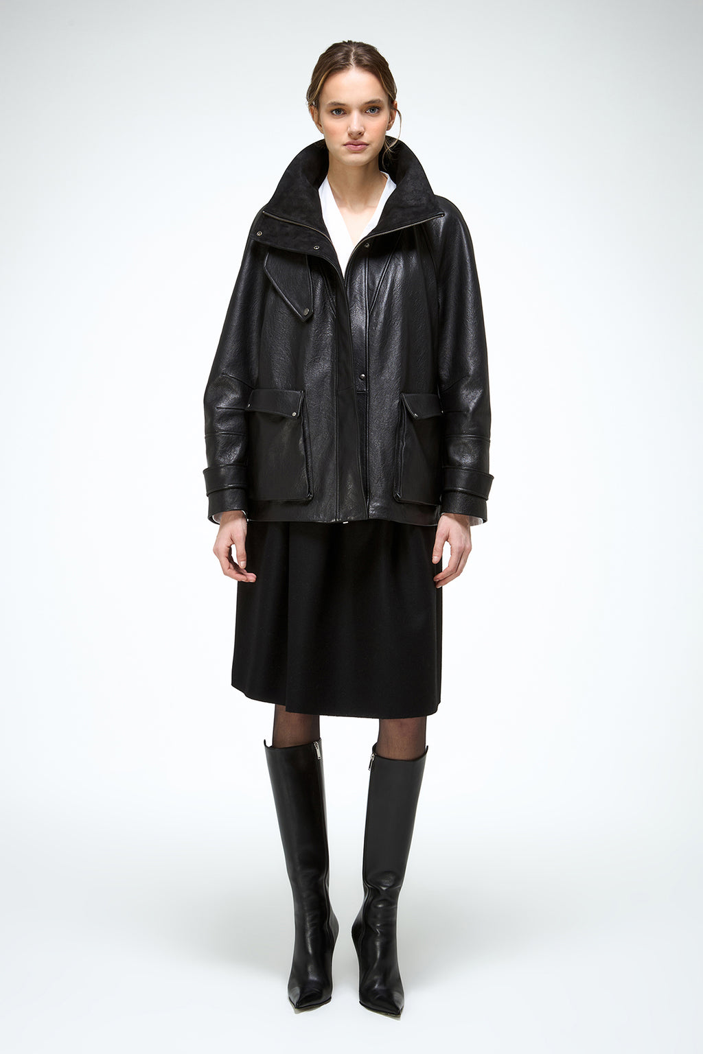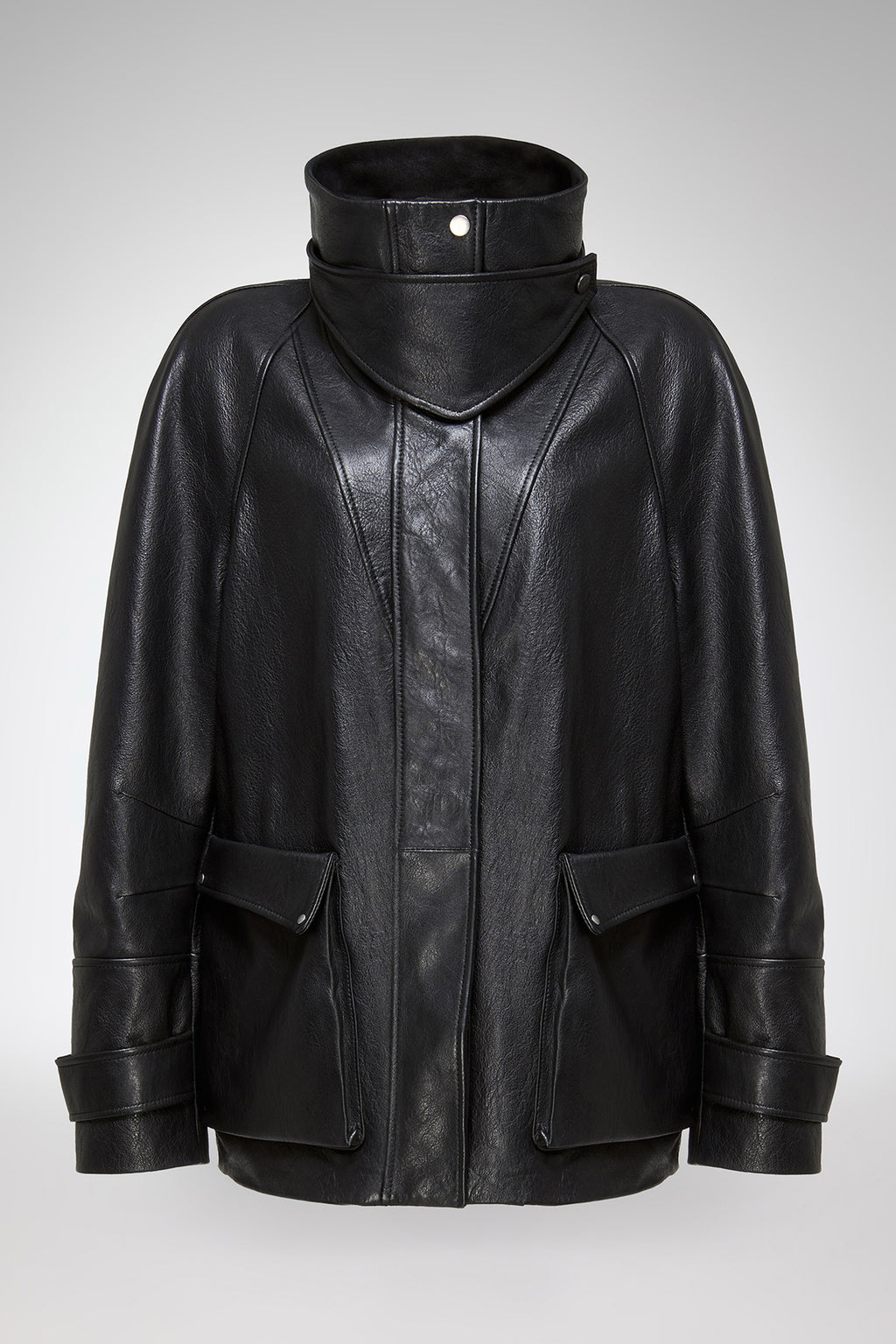 Übergroße Jacke im Parka-Stil mit Trichterkragen, verdecktem Frontreißverschluss und Druckknopfleiste vorne. Mit aufgesetzten Pattentaschen, strukturiertem Leder. Gürtel-Detail an den Ärmelbündchen.