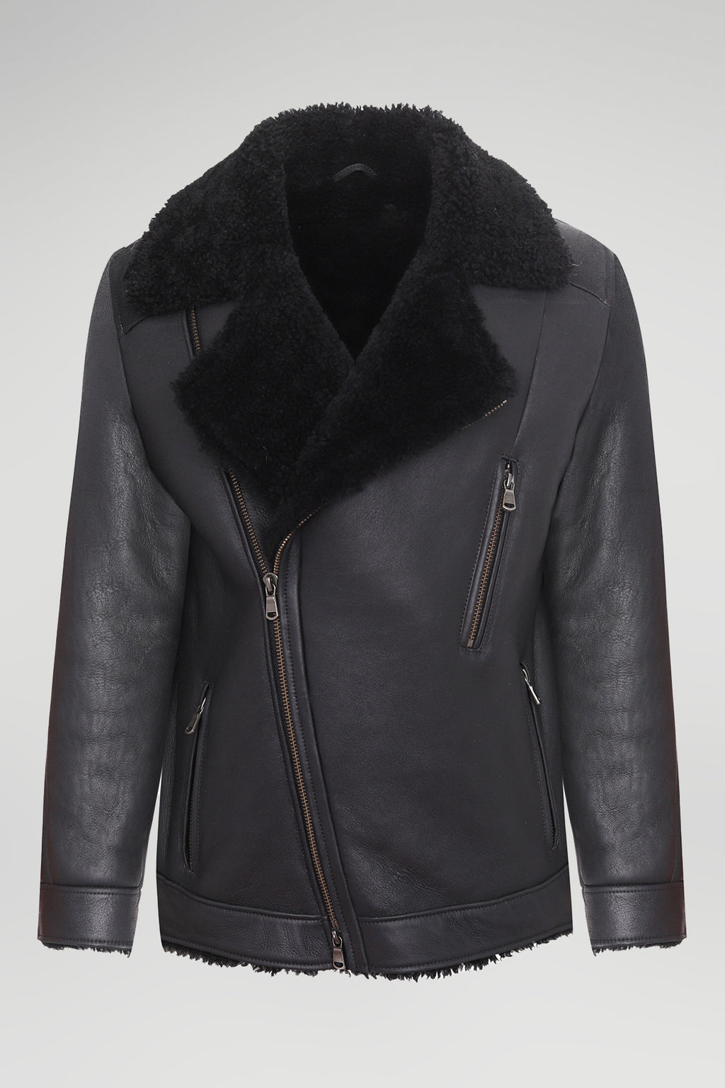Shearling-Lederjacke mit fallendem Revers. Innenfutter und Kragen aus Shearling. Asymmetrischer Reißverschluss. Reißverschlusstaschen vorne und eine Brusttasche. Angenehm weich.