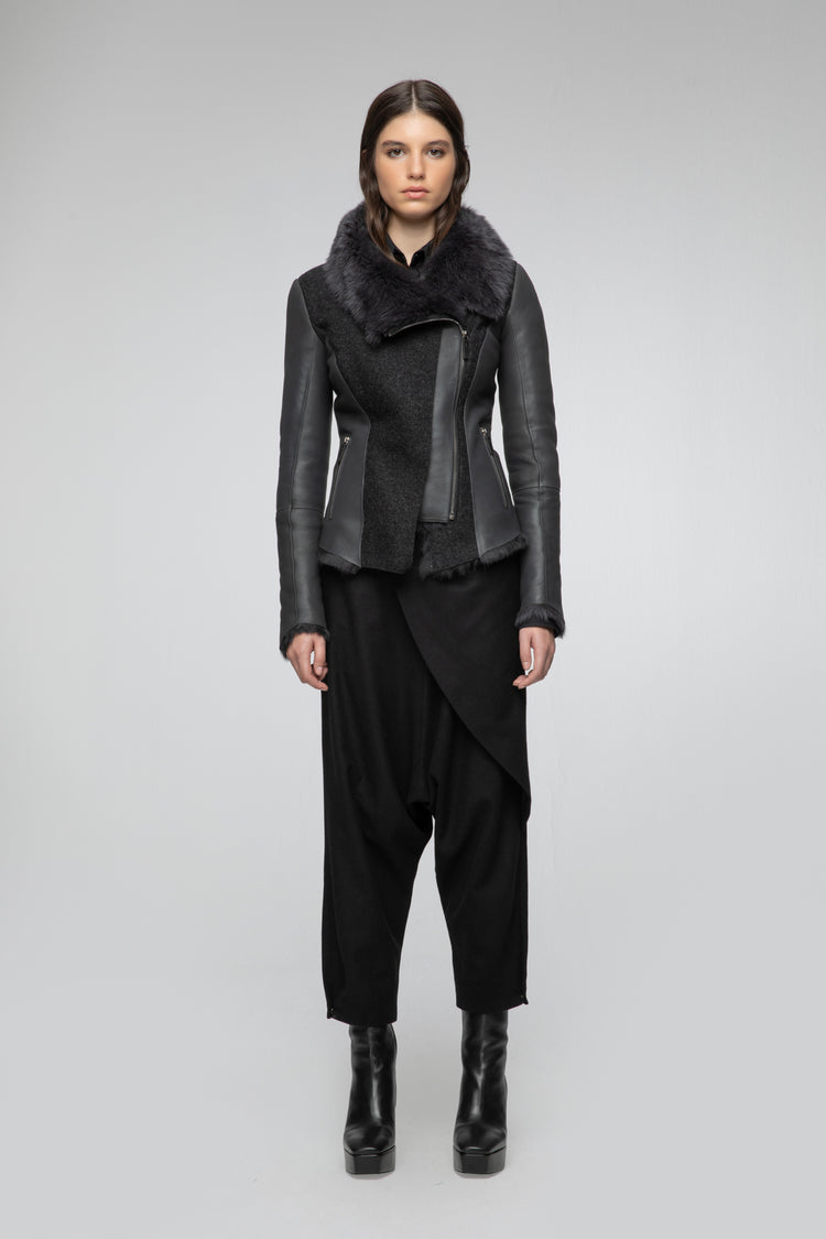 Elegante Shearling-Jacke mit feinem Pelzbesatz innen. Textildetails vorne. Asymmetrischer Reißverschluss. Seitliche Reißverschlusstaschen. Angenehm weich.