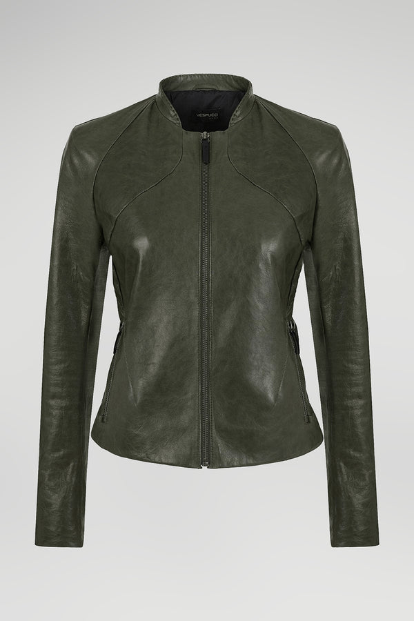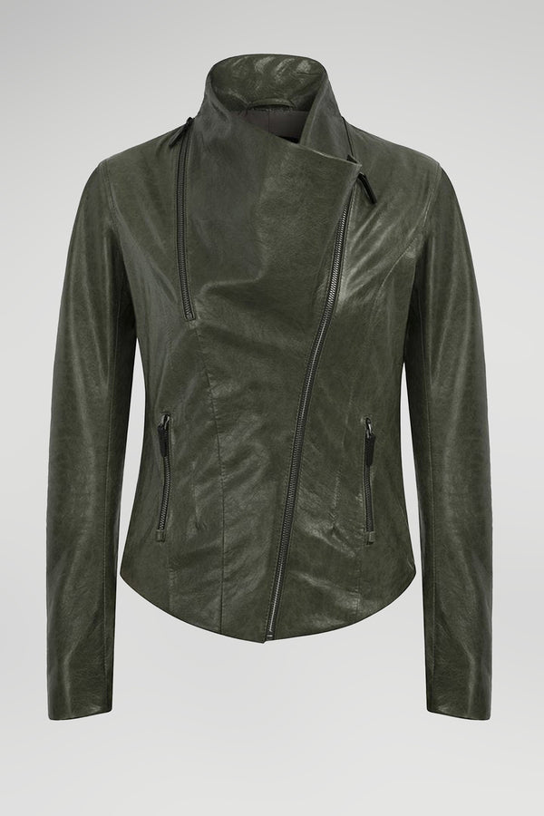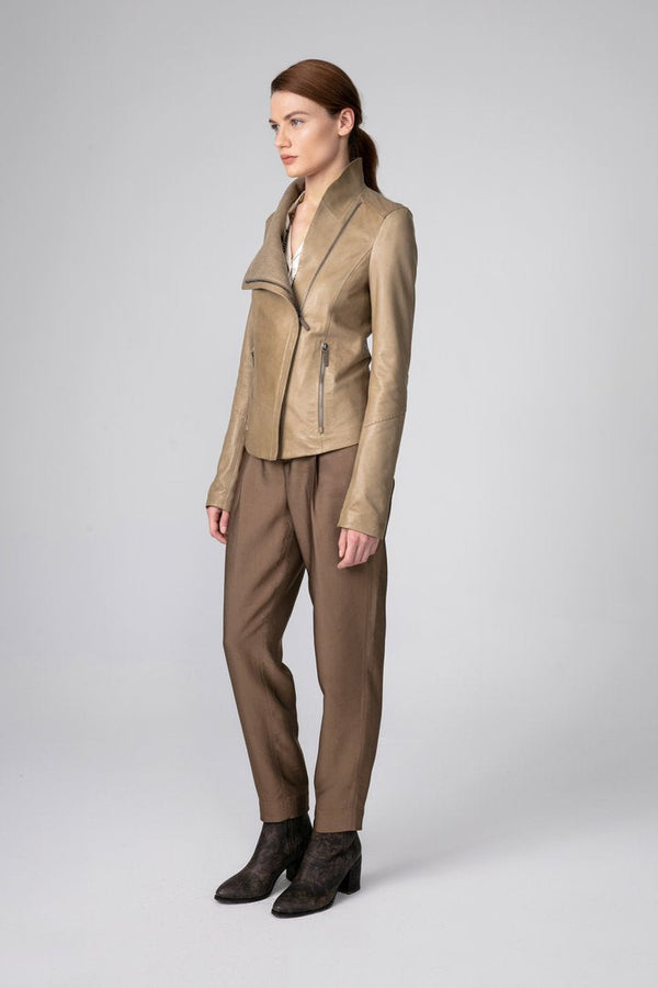 Our leather jackets for women are available in different styles and colors, from black to grey and brown to beige. Special details include the high collar and asymmetrically sewn zippers or button plackets.