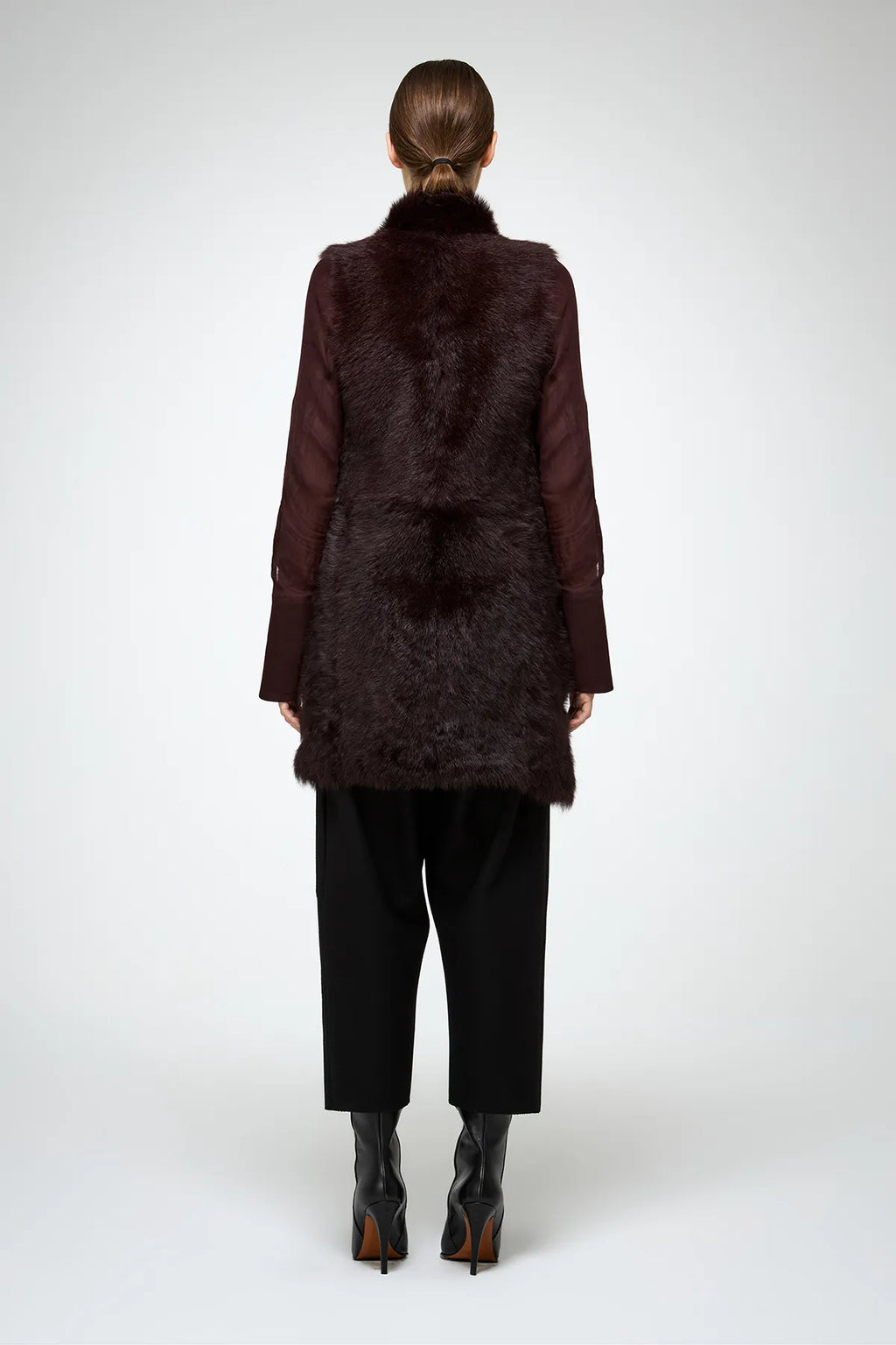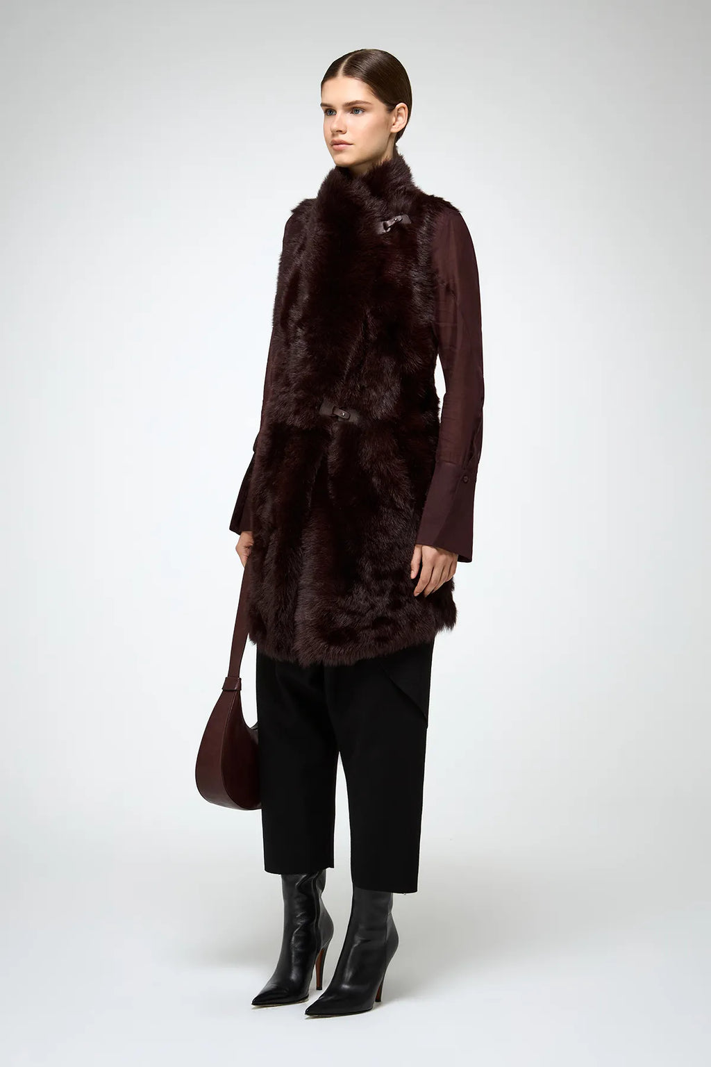 Knielange Shearling-Weste mit asymmetrischem, überkreuztem Doppelverschluss vorne. Seitliche Taschen.