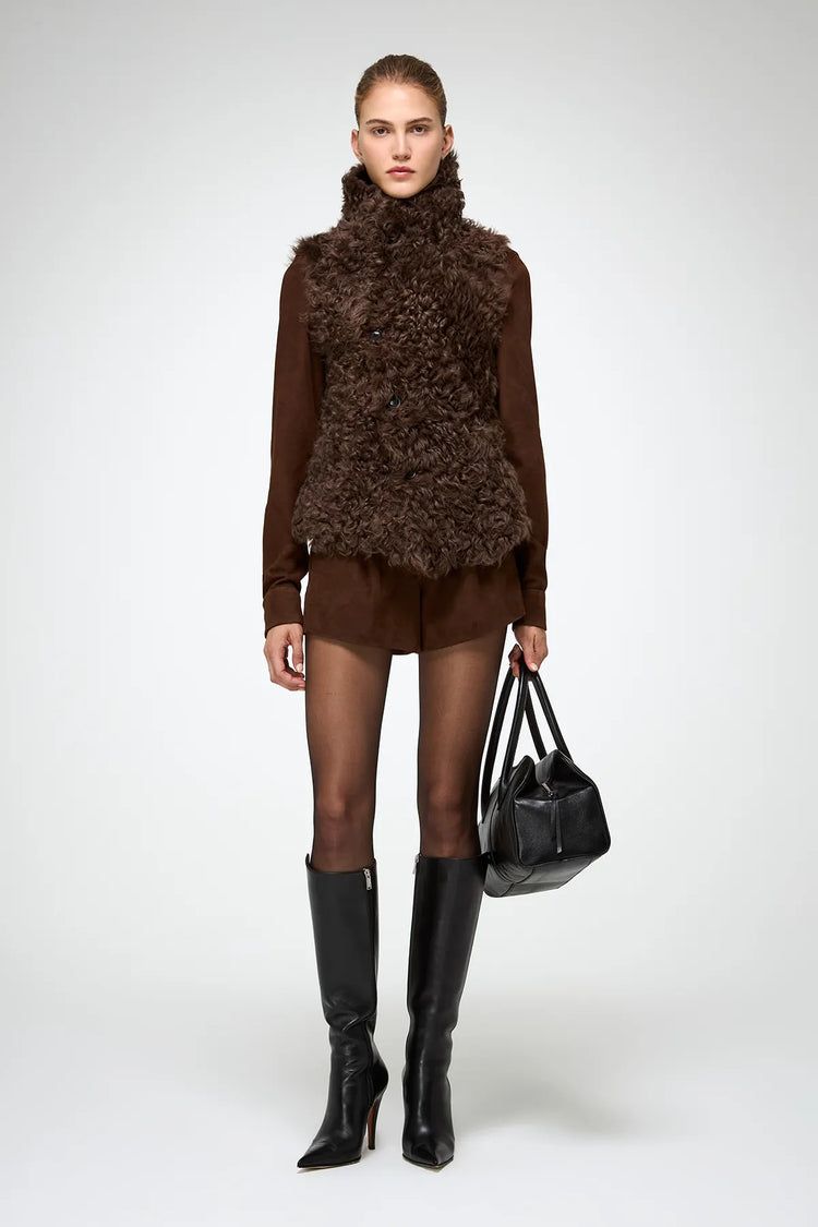 Hüftlange, kurze Shearling-Weste mit asymmetrischem Überkreuzmuster vorne. Stehkragen. Kastenförmiger Schnitt.