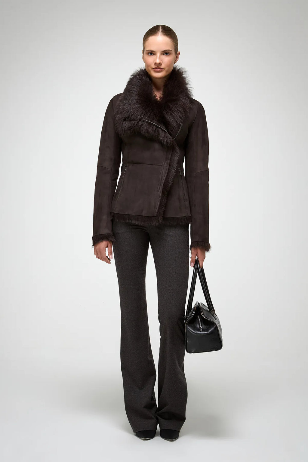 Taillierte Shearling-Jacke mit asymmetrischem, verdecktem Überkreuzreißverschluss und Seitentaschen.