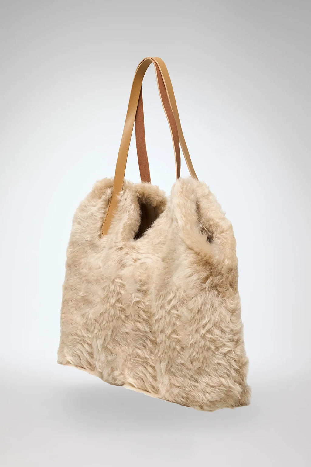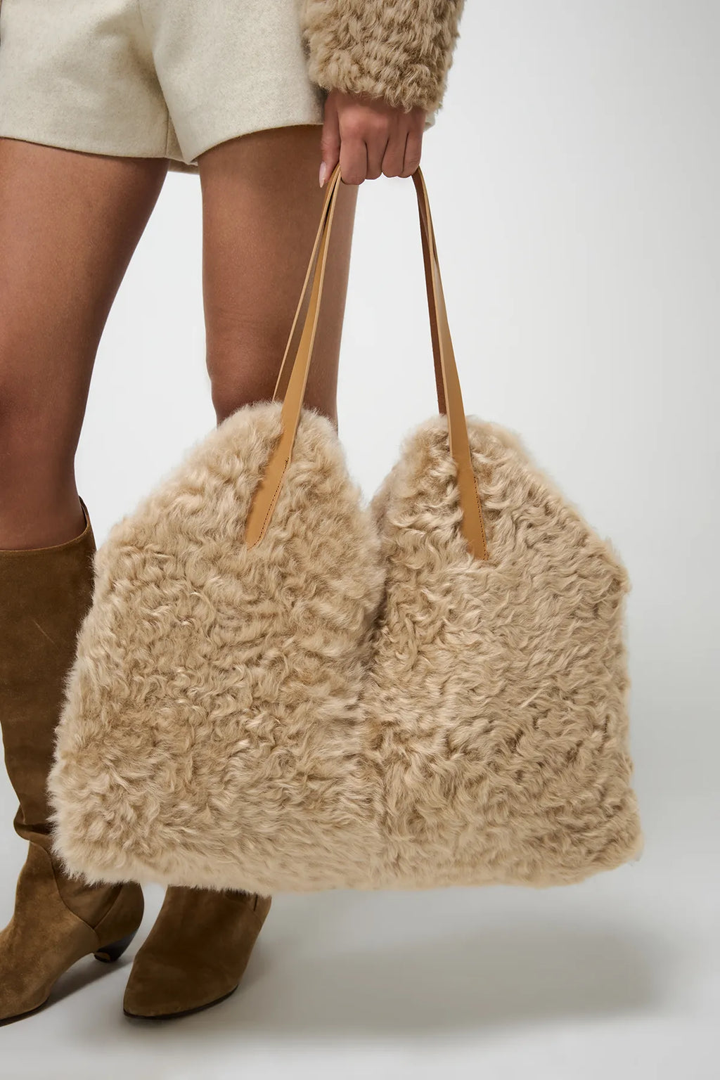 Große Tragetasche aus Lammfell mit Ledertaschen.