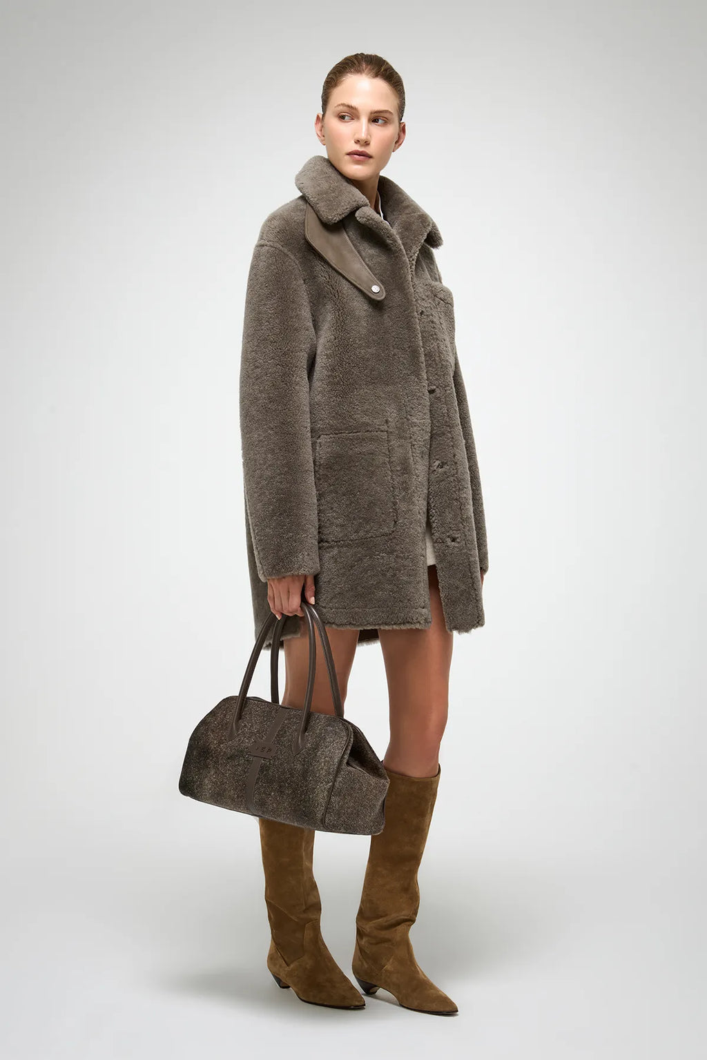 Hüftlange Shearling-Jacke mit geradem Schnitt und überschnittenen Schultern. Sie verfügt über eine durchgehende Knopfleiste, aufgesetzte Außentaschen und einen abnehmbaren Kragen mit Druckknopfverschluss. Gefertigt aus 100 % Lammleder für einen weichen und dennoch strukturierten Look.