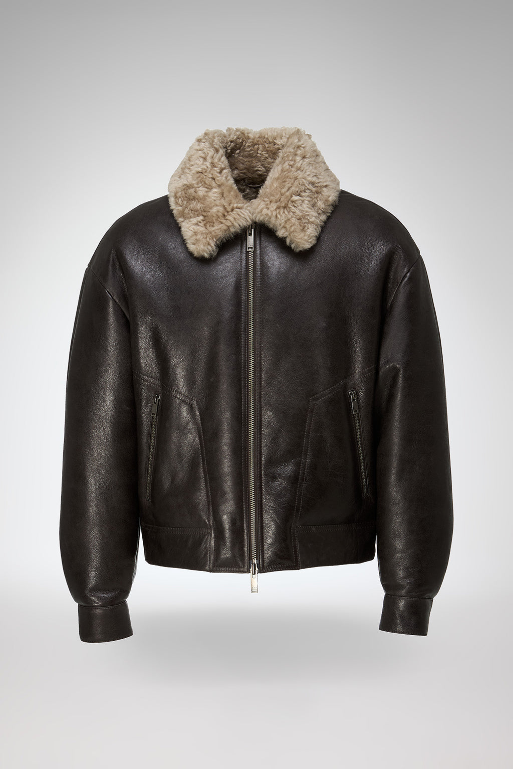 Crafted from lamb leather. Aviator style cropped leather jacket with double sided zipper, side pockets and shearling fur shirt collar.