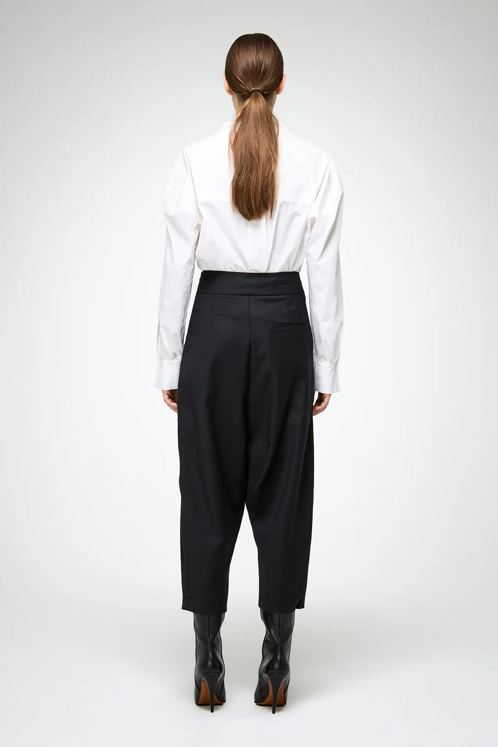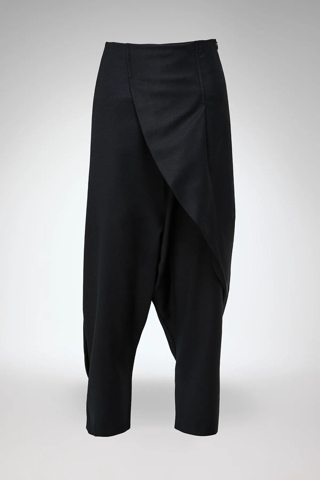 Hose aus Woll-Lycra mit tiefem Schritt und überkreuzten Klappen.