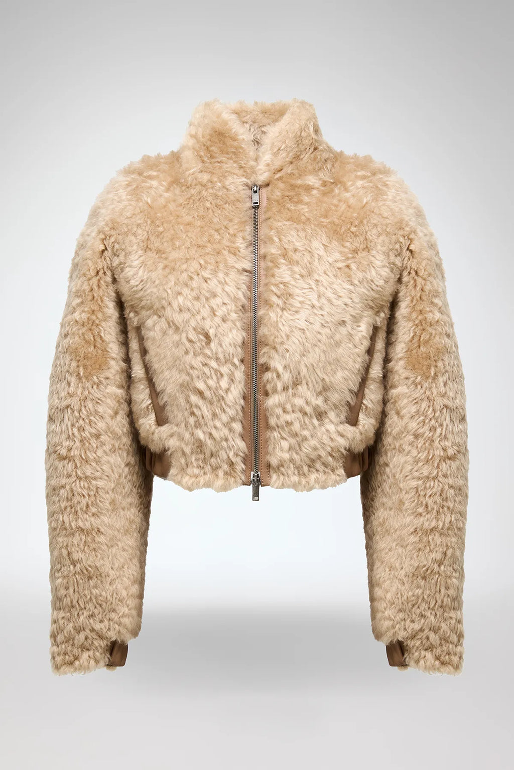 Kurze Bomberjacke aus Shearling mit doppelseitigem Frontreißverschluss und Lederdetails. Elastischer Bund. Seitentaschen. Normale Passform.