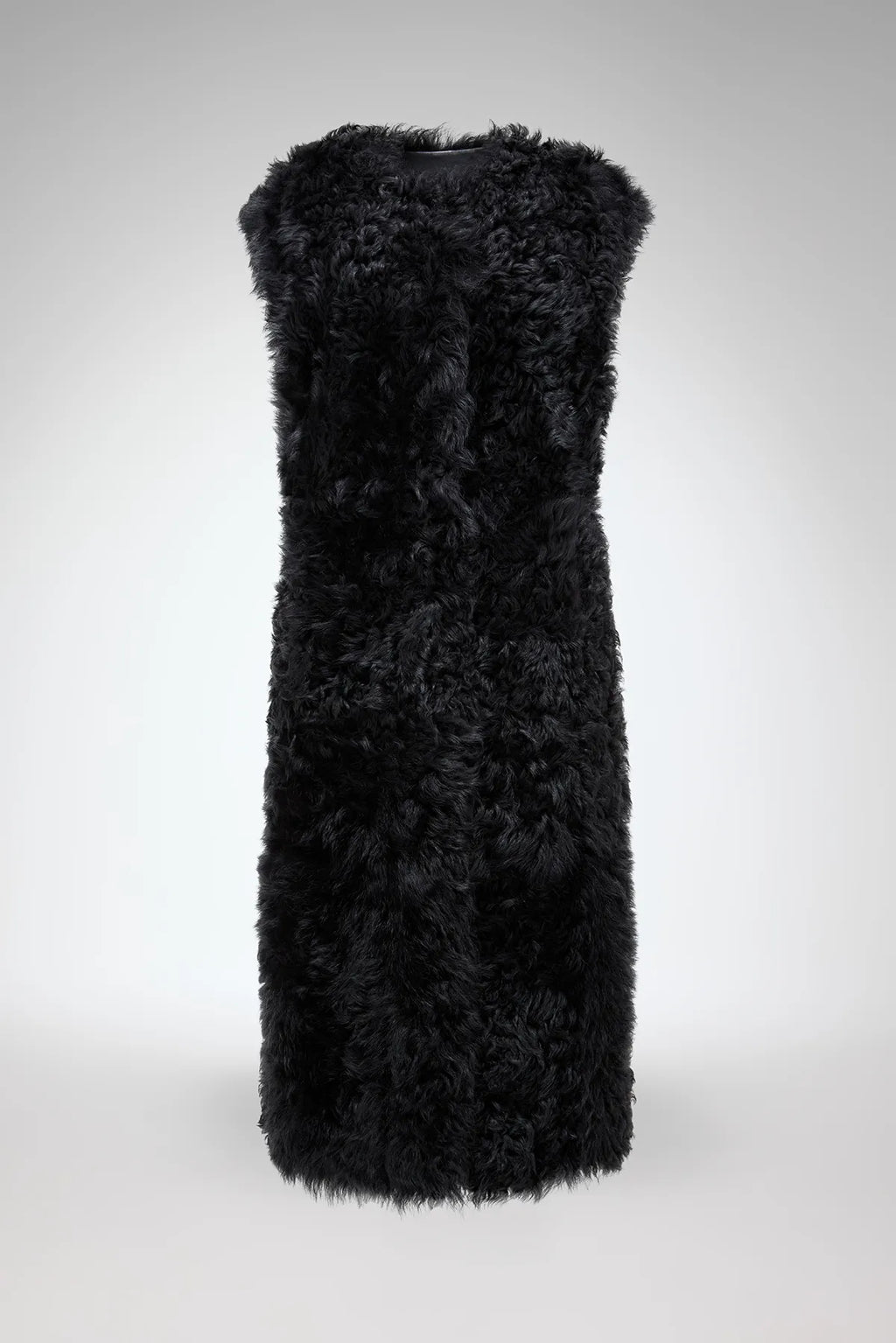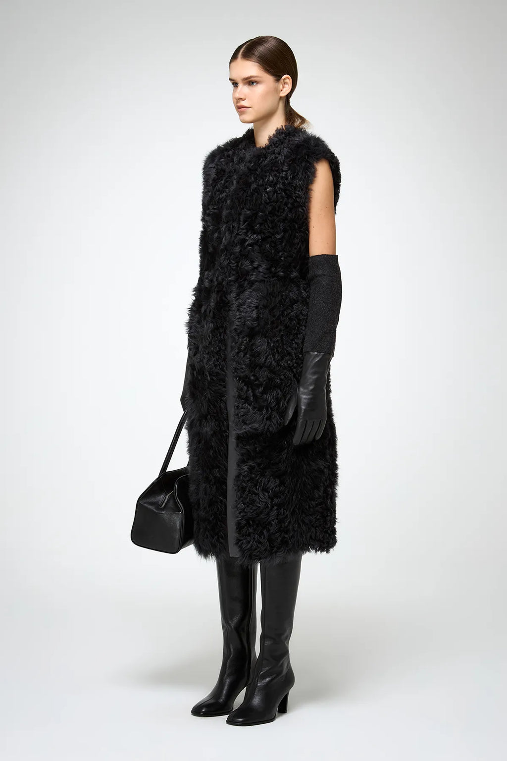 Knielange, gerade geschnittene Shearling-Weste mit Leder-Druckknopfleiste. Seitliche Taschen.