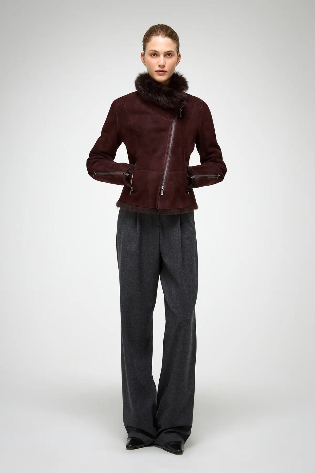 Figurbetonte Shearling-Jacke mit asymmetrischem, überkreuztem Reißverschluss und seitlichen Reißverschlusstaschen. Reißverschlussdetails an den Ärmelbündchen.
