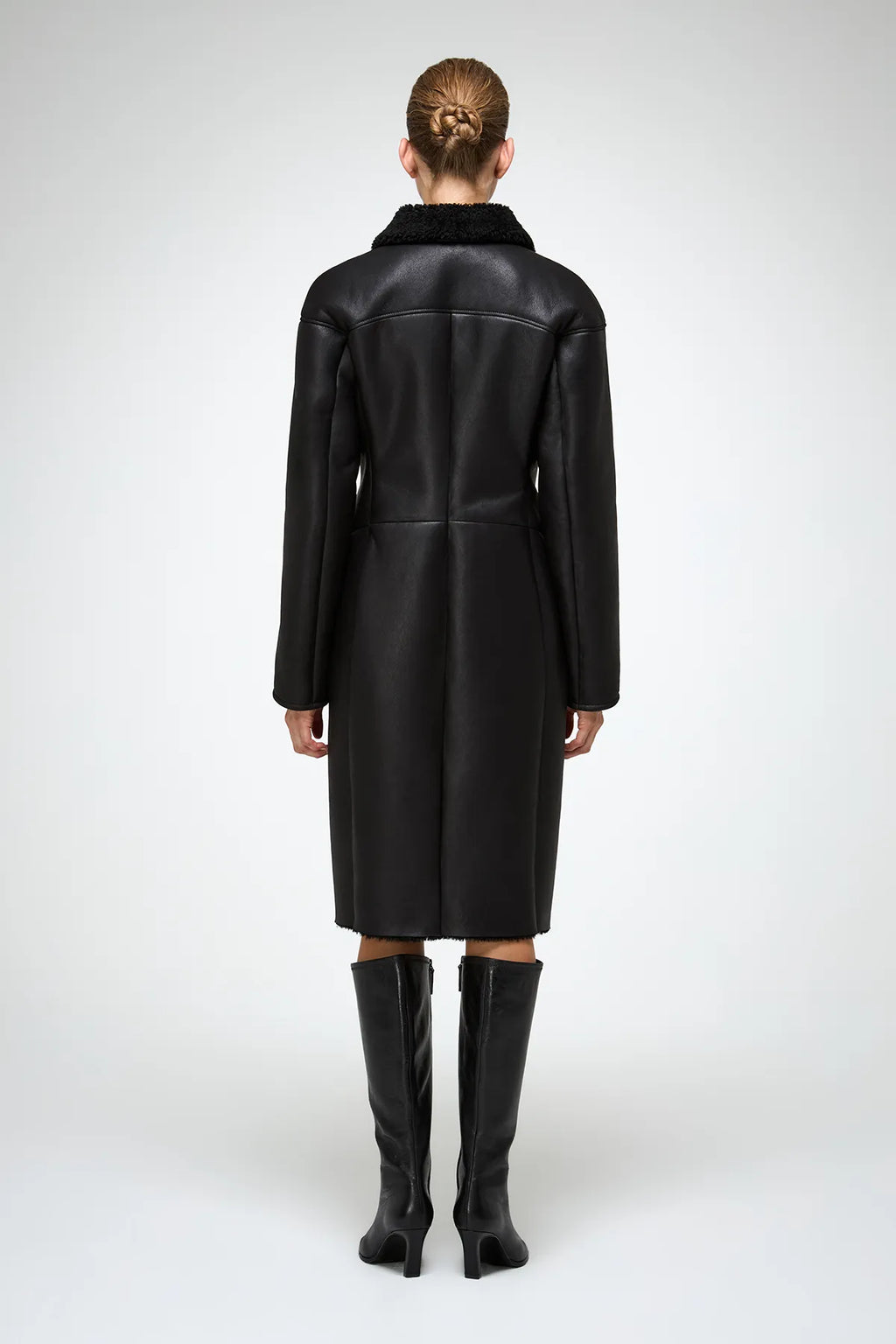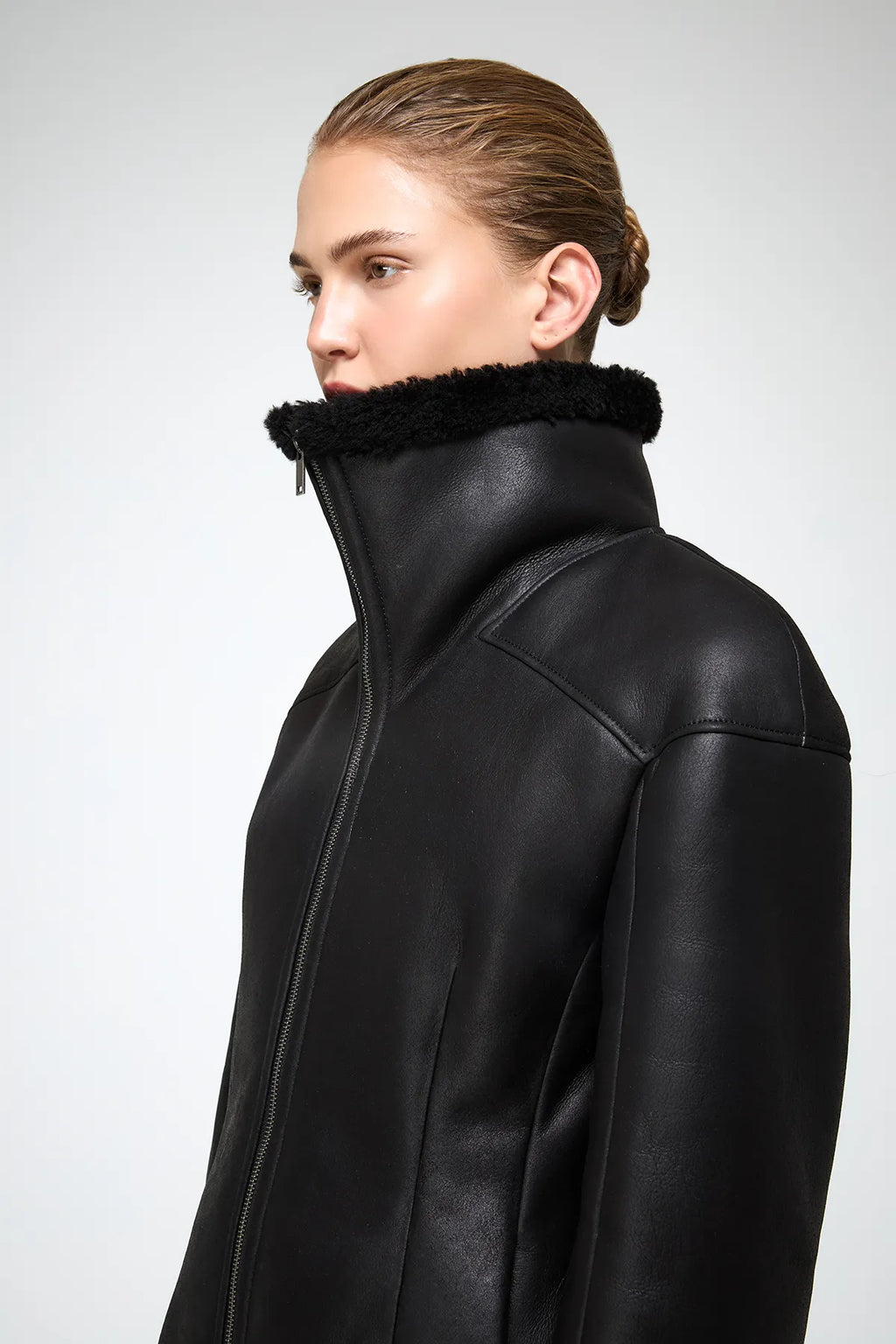 Dieser knielange Mantel aus 100 % Lammleder besticht durch einen Reißverschluss vorne, strukturierte Schultern und eine taillierte Silhouette. Seitliche Taschen und ein hoher Stehkragen runden das elegante Design ab.