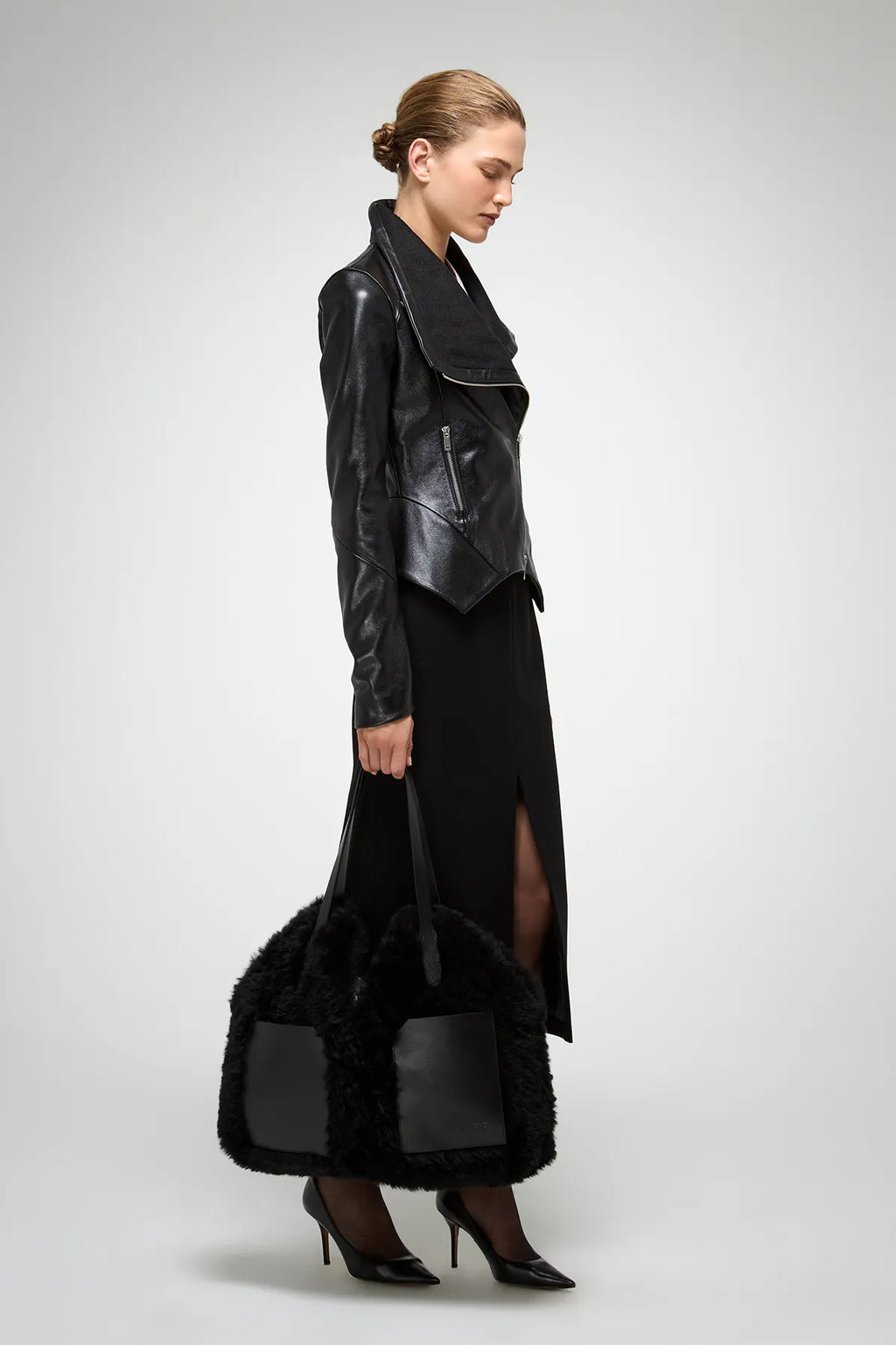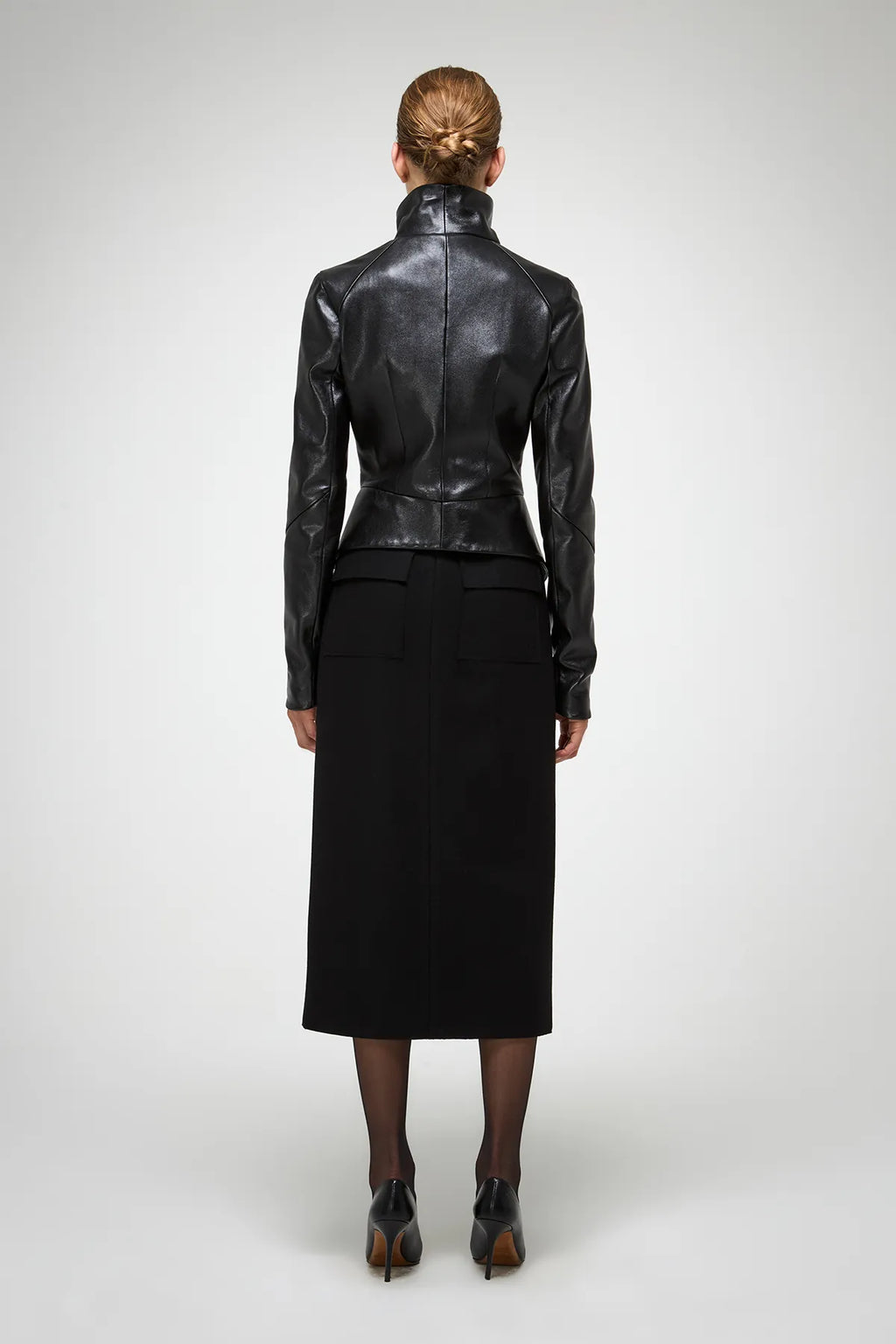 Figurbetonte, kurze Lederjacke mit asymmetrischem Reißverschluss und seitlichen Reißverschlusstaschen. Stoffgefütterter Innenkragen und U-förmiger, spitz zulaufender Saum für eine taillierte, moderne Silhouette.