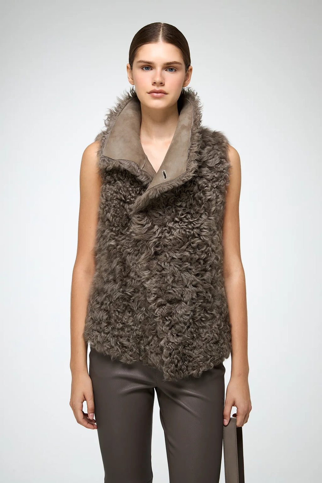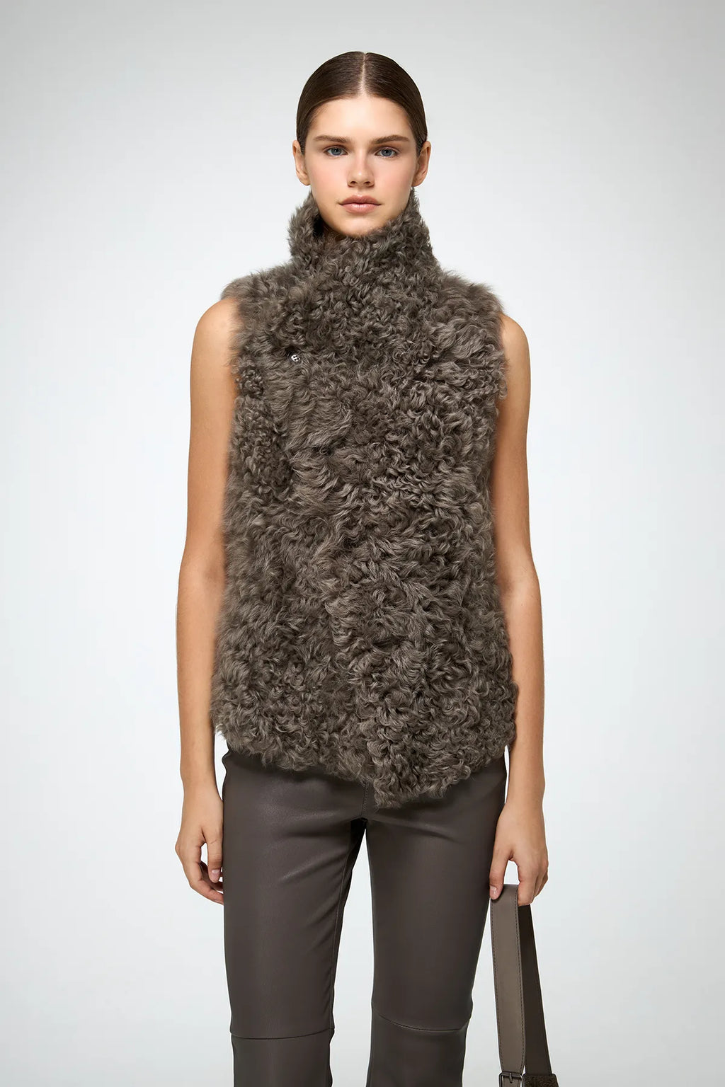 Hüftlange, kurze Shearling-Weste mit asymmetrischem Überkreuzmuster vorne. Stehkragen. Kastenförmiger Schnitt.
