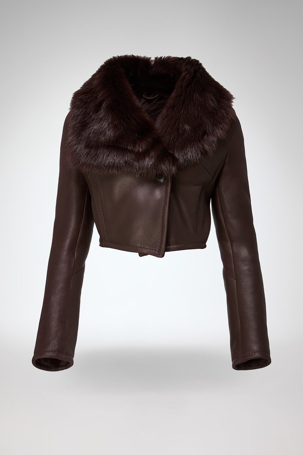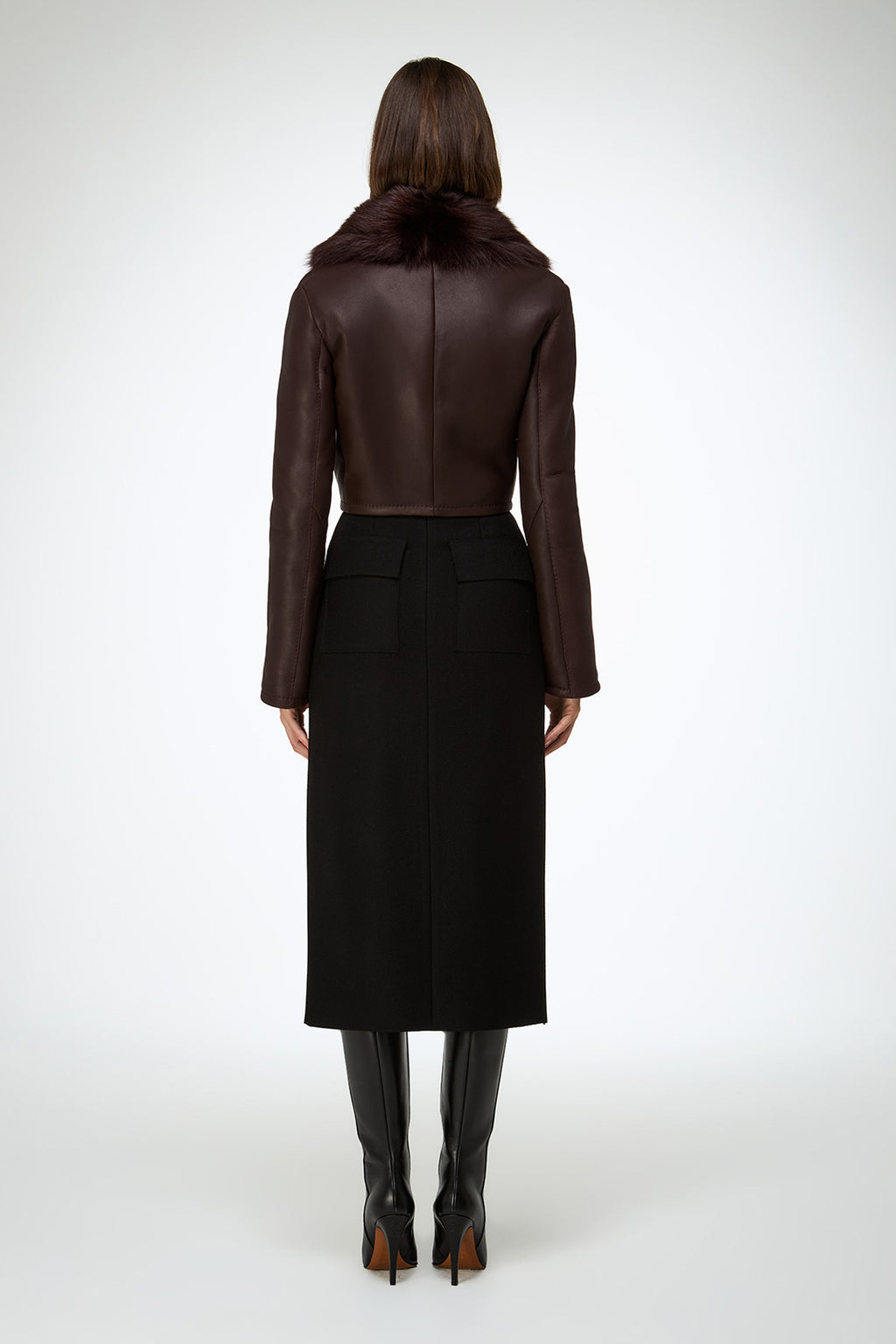 Cropped fur-collared jacket. Regular fit. V-shaped hemline.
