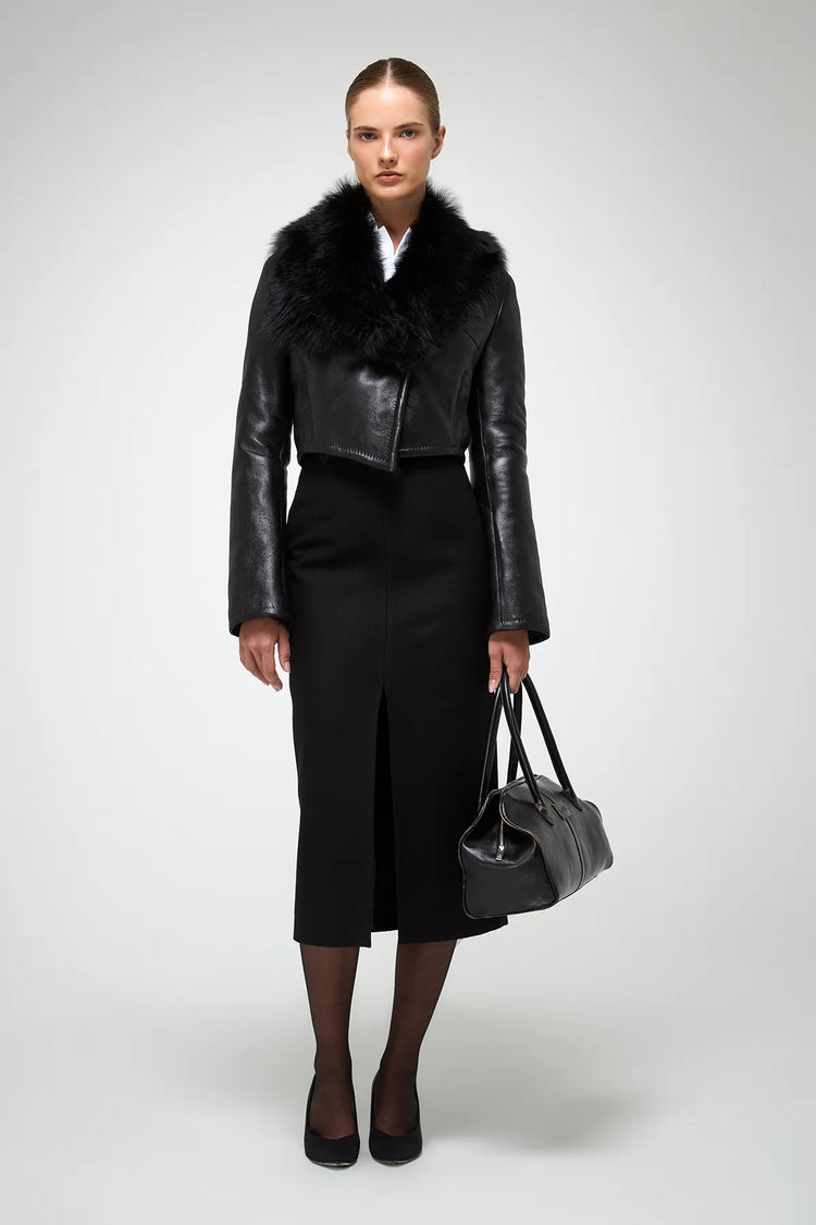 Kurze Jacke mit Pelzkragen. Normale Passform. V-förmiger Saum.