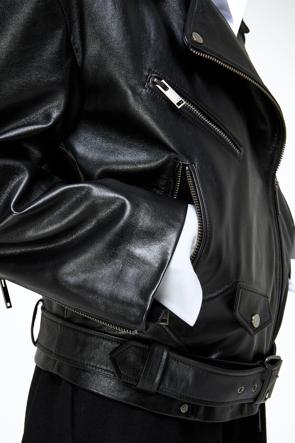 Hochwertiges Lammleder. Jacke im Biker-Stil. Asymmetrischer Reißverschluss, Druckknopfverschluss. Kragen im Biker-Stil und Reißverschluss an den Ärmelbündchen. Hüftlang, mit Gürtel und Taillenschnalle. Drei Reißverschlusstaschen und eine Feuerzeugtasche.