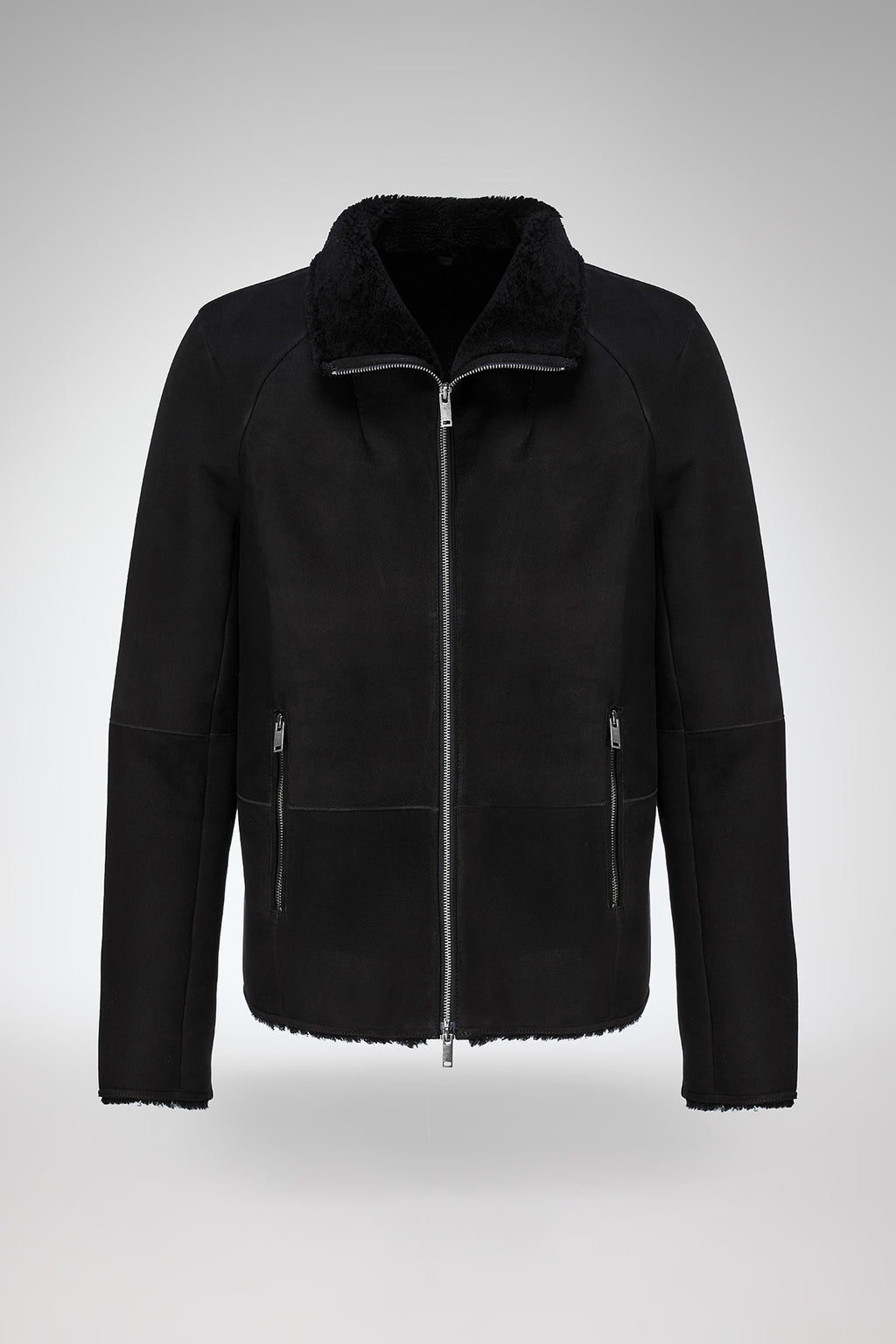 Outside leather, inside shearling embellished biker jacket. Asymmetrical zipper closure and asymmetrical hem line. Leather straps with snap at hem and welt pockets with zipper at both sides. Soft touch.