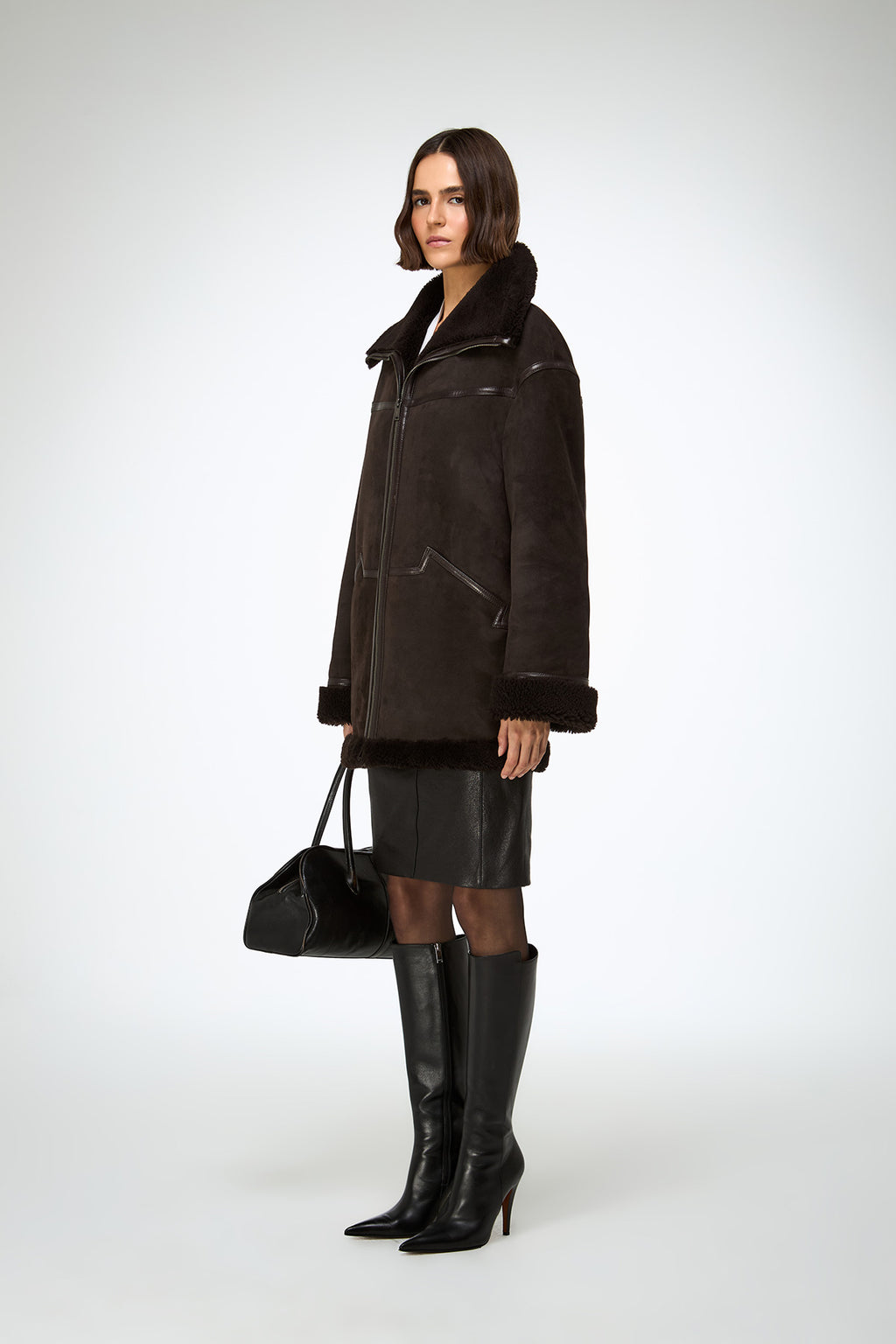 Crafted in soft lamb shearling leather with oversize silhoutte, front pockets, stand up collar, double zipper closure, fur trimmed hem and cuff line.
