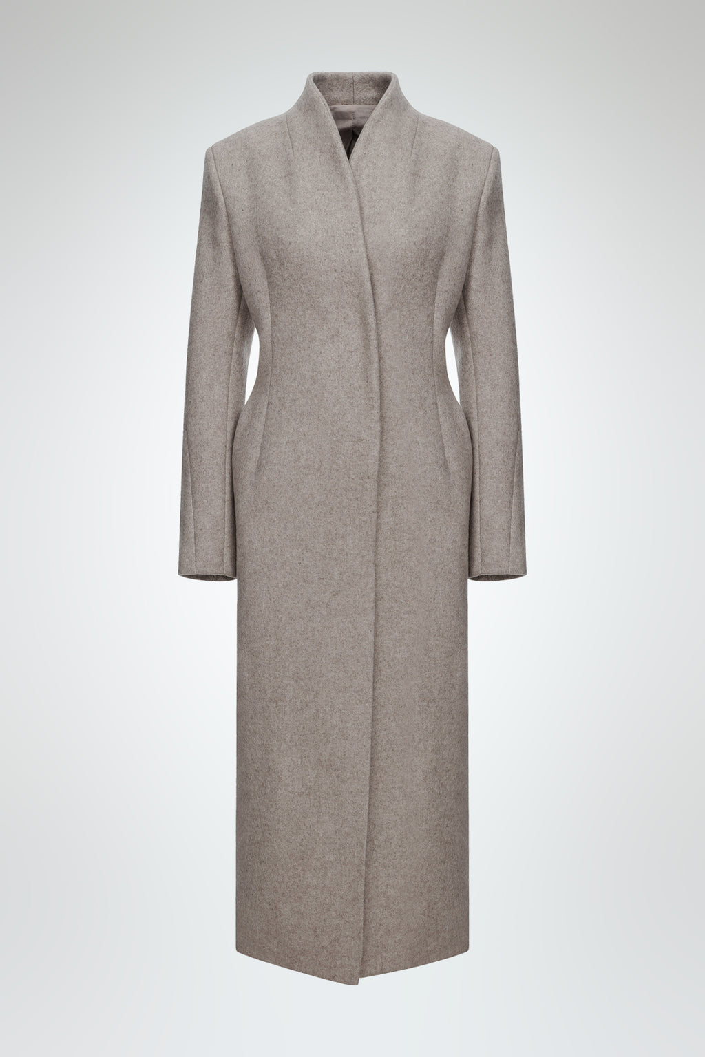 Langer, taillierter Wollmantel mit markant geformten Schultern. Eingrifftaschen, verdeckter Knopfverschluss, hoher Rundkragen und überkreuzte Vorderseite.
