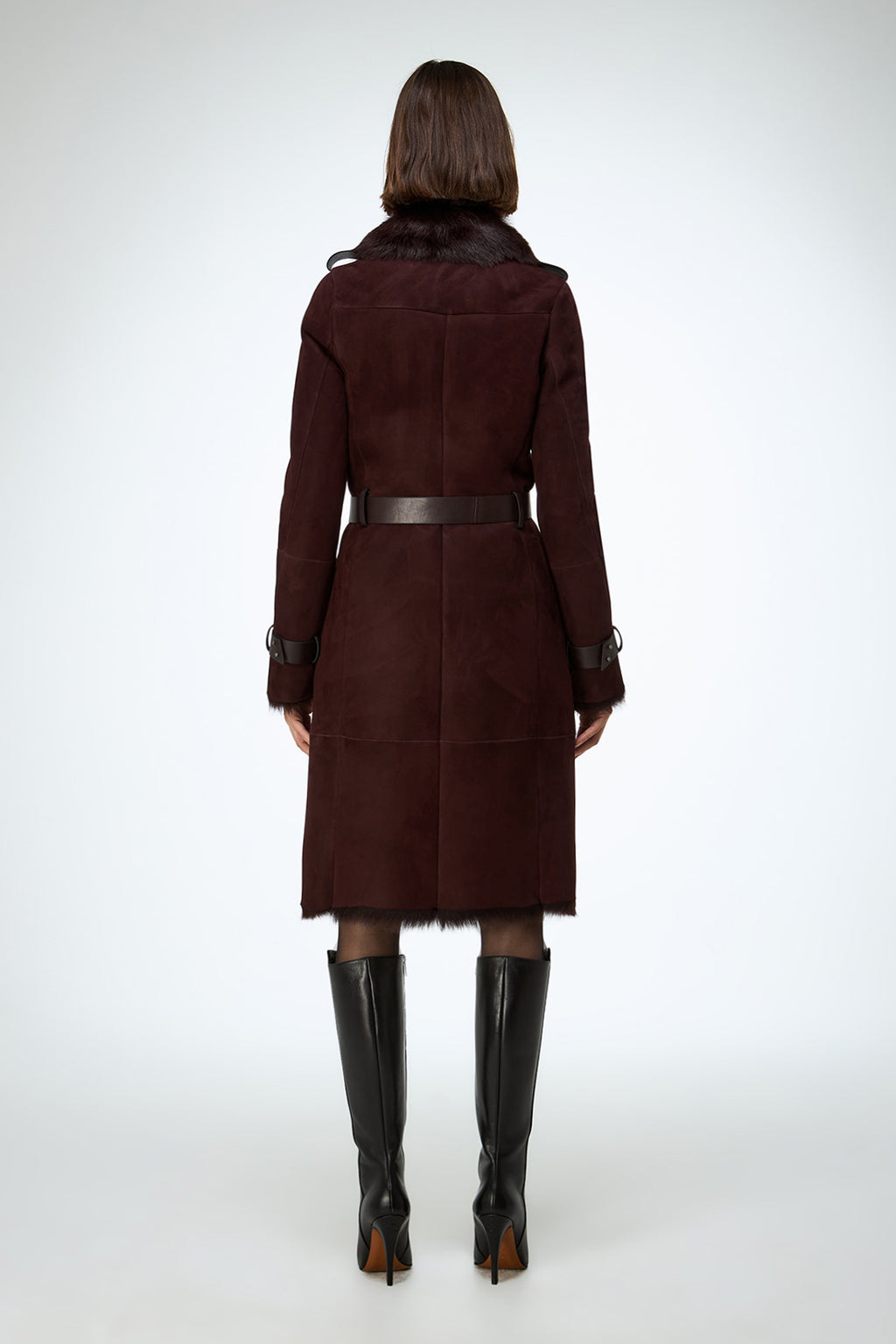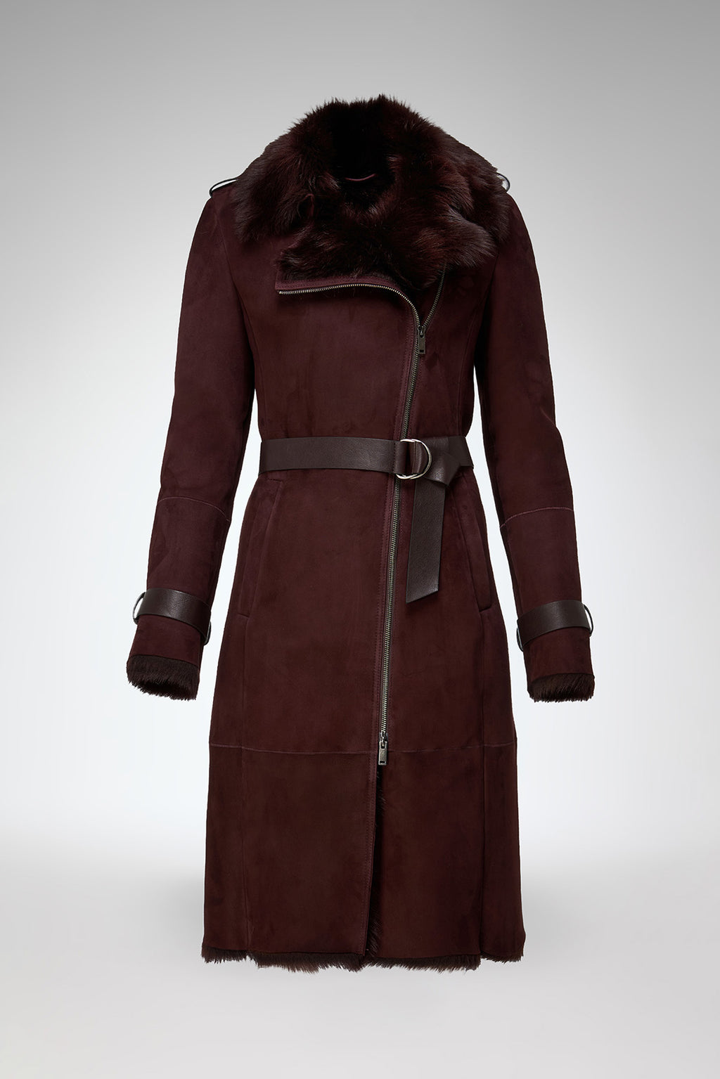 Crafted from 100% lamb leather, this tailored long shearling coat features a front zip closure and a belted waist. Designed with structured shoulders and sleeve tabs, plus cuff strap details for an elevated, refined look.Includes side pockets.