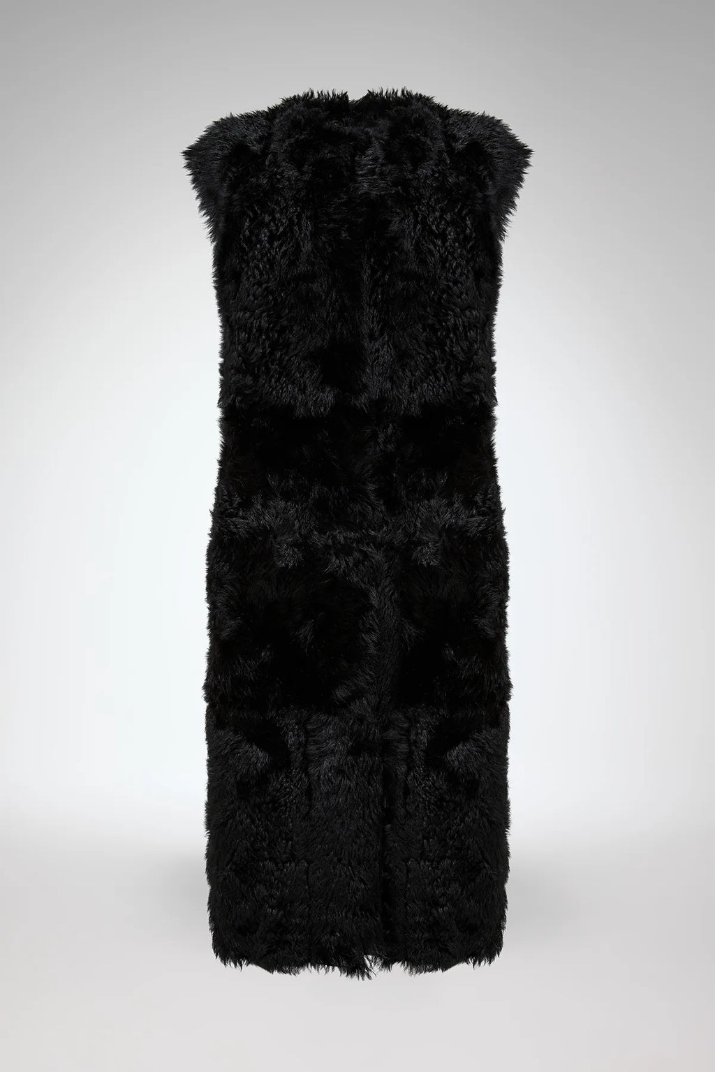 Knielange, gerade geschnittene Shearling-Weste mit Leder-Druckknopfleiste. Seitliche Taschen.
