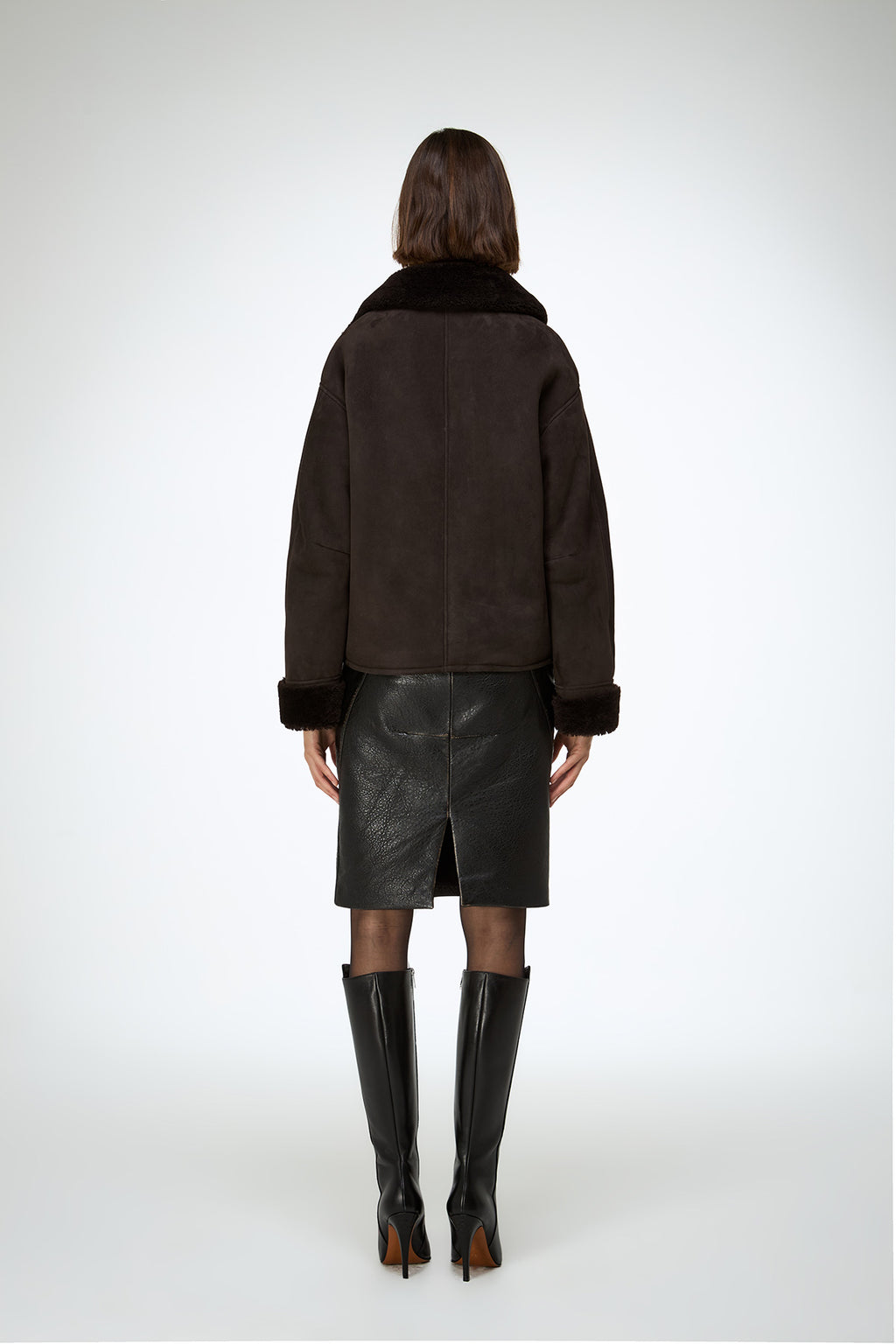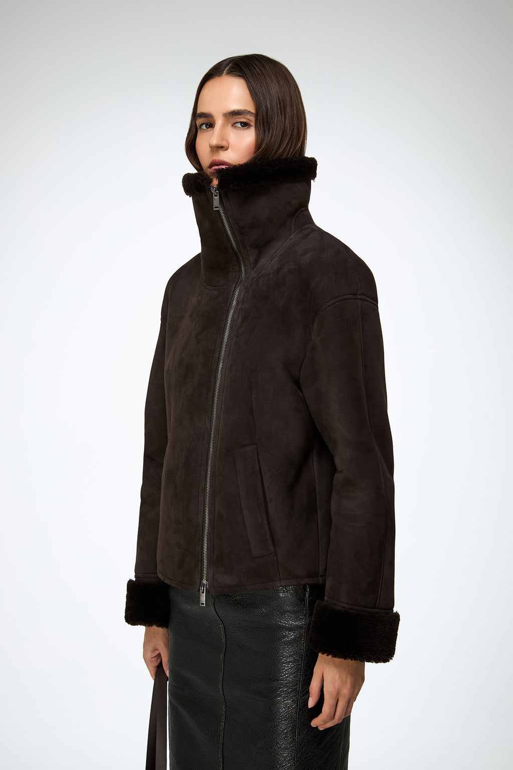 Cropped boxy-fit shearling jacket with asymmetrical crossover zip closure,stand-up collar,and side pockets