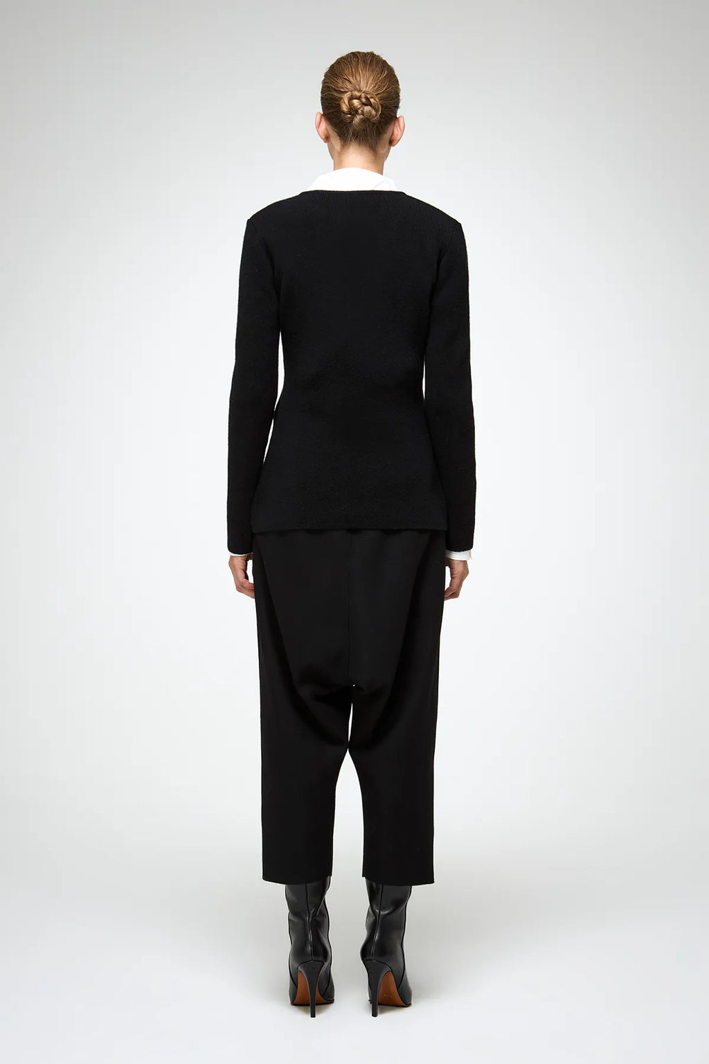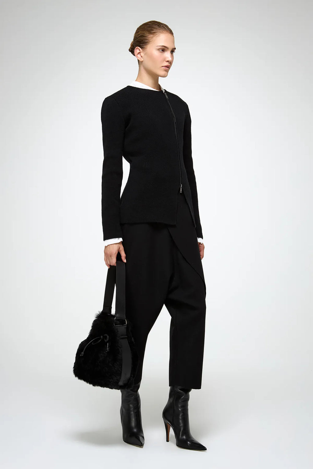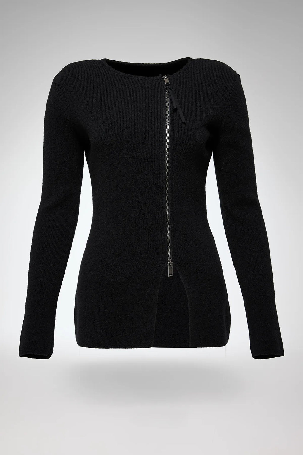 Figurbetonte, gerippte Strickjacke aus Merinowollmischung. Beidseitiger Reißverschluss. V-förmiger Saum.