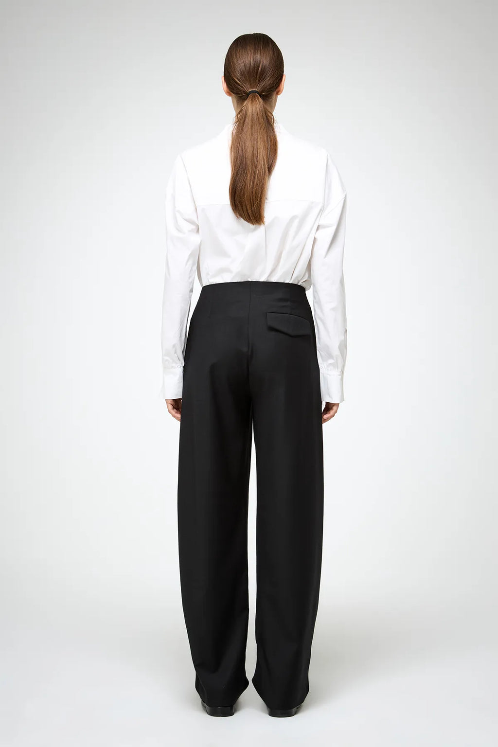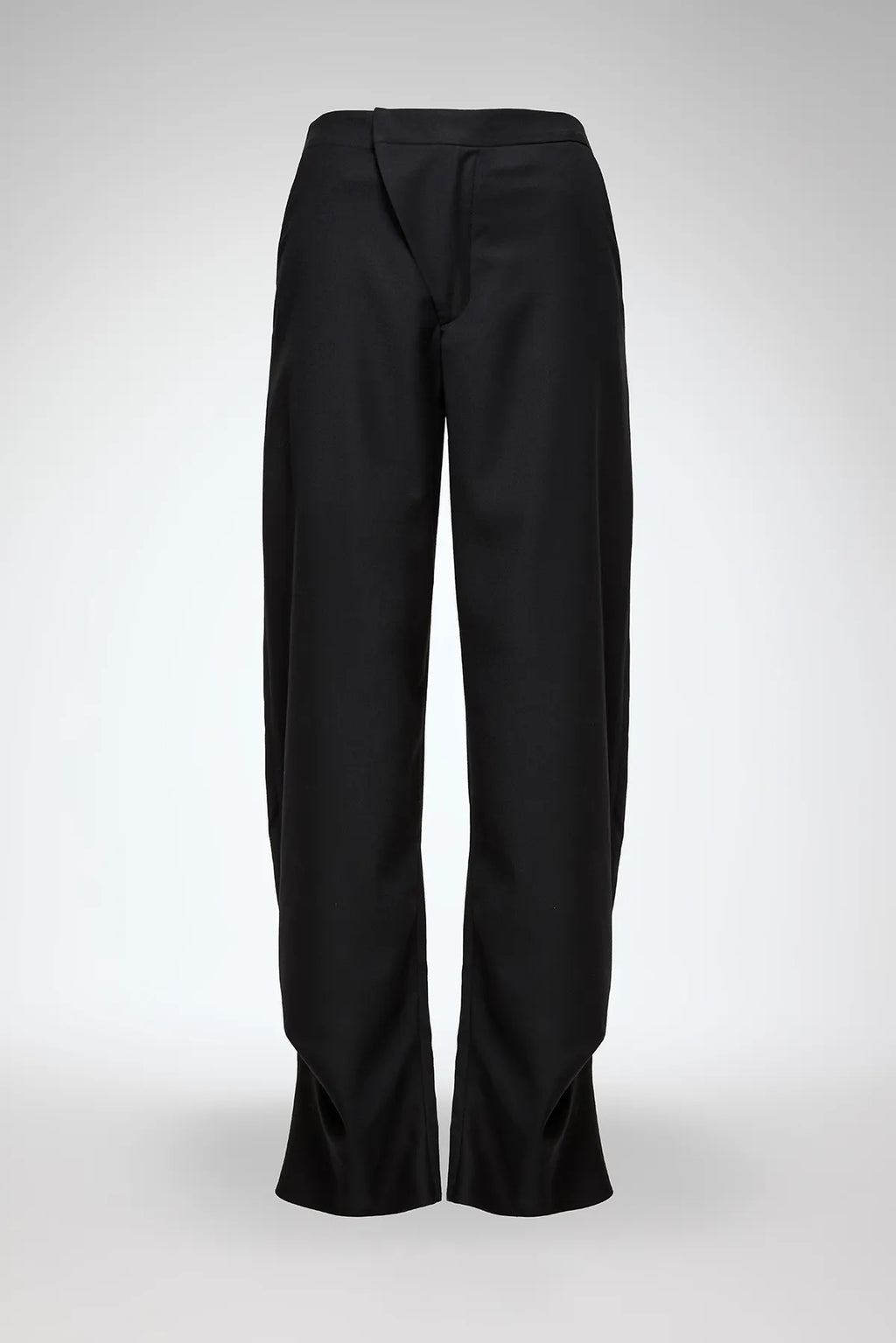 Gerade geschnittene Hose aus Woll-Lycra. Asymmetrische Knopfleiste mit verdecktem Reißverschluss. Seitentaschen.