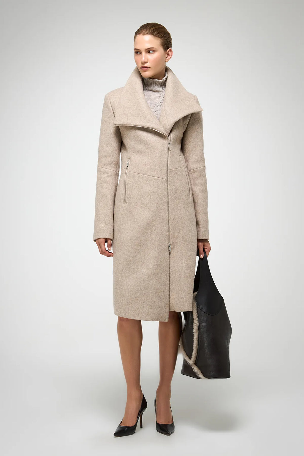 Mittellanger Wollmantel mit asymmetrischem Reißverschluss und Stehkragen. Strukturierte, taillierte Passform mit seitlichen Reißverschlusstaschen.